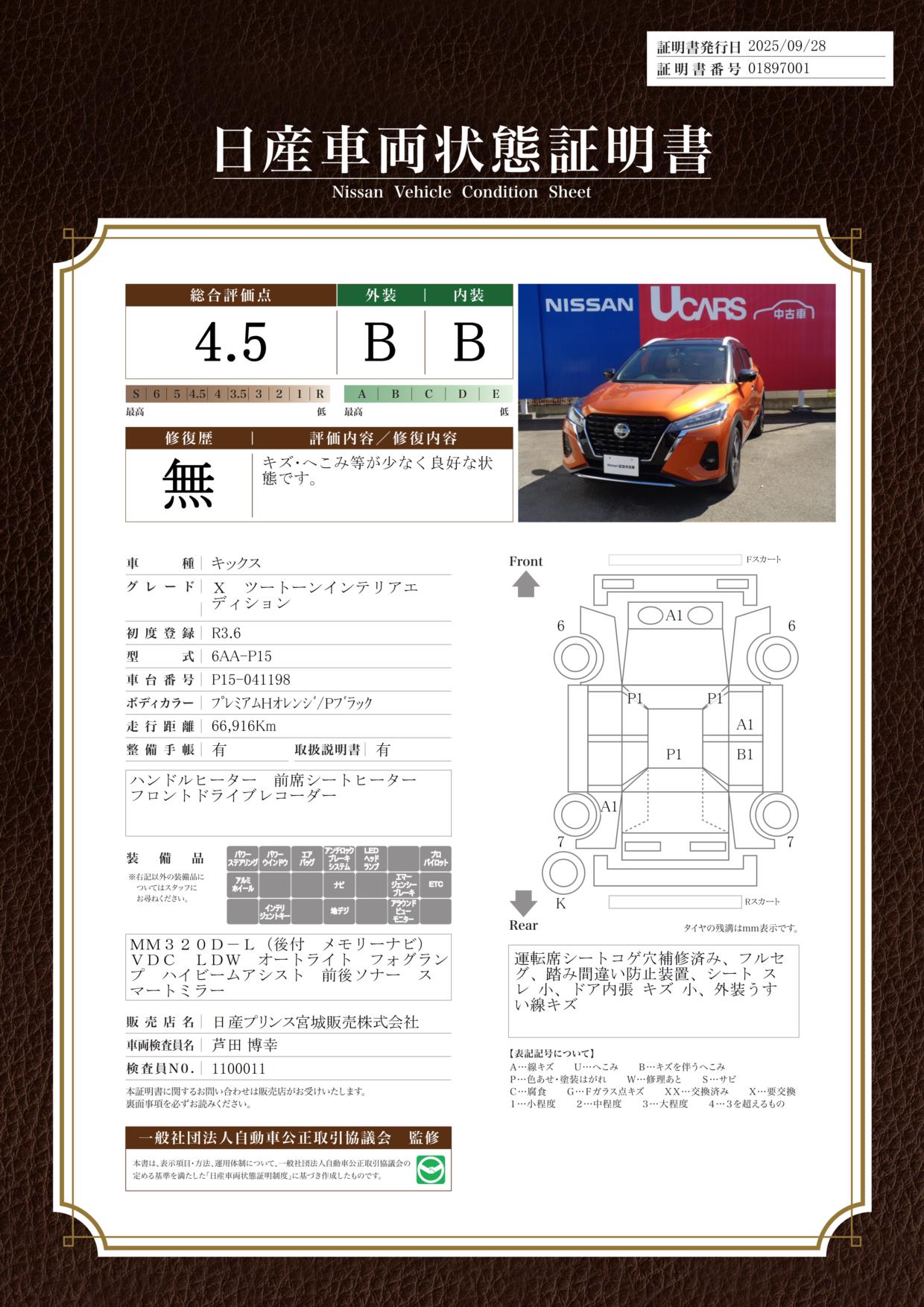 見た目も中身もスタイリッシュなコンパクトSUVの“キックス”です(*^▽^*)●日産純正メモリーナビ(MM320D-L)●バックカメラ●アラウンドビュー●純正リモコンスタータ●ETC