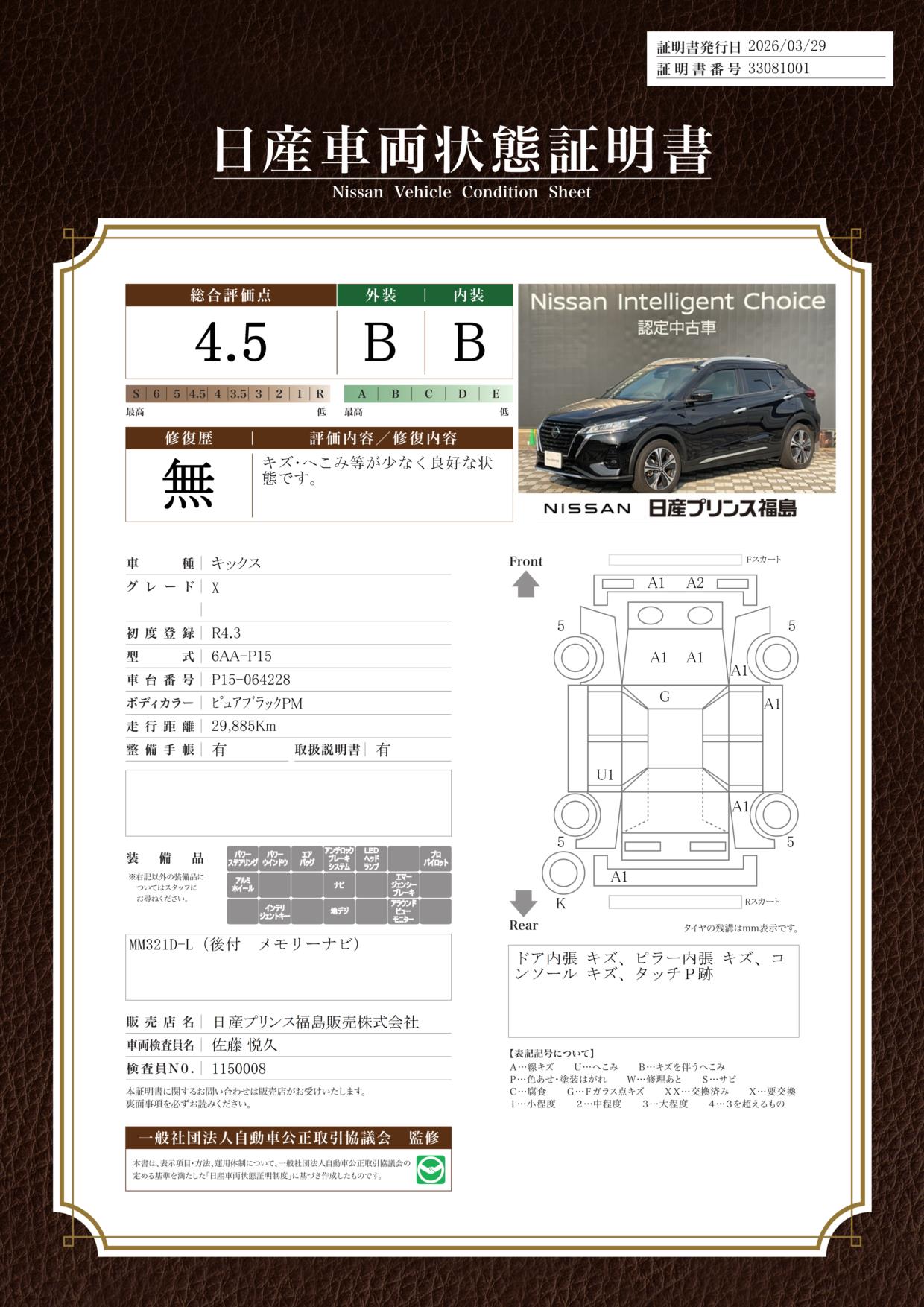 「車両状態証明書」は、査定協会監修のプロの検査員が公正かつ確かな基準で検査した”安心の証”です。