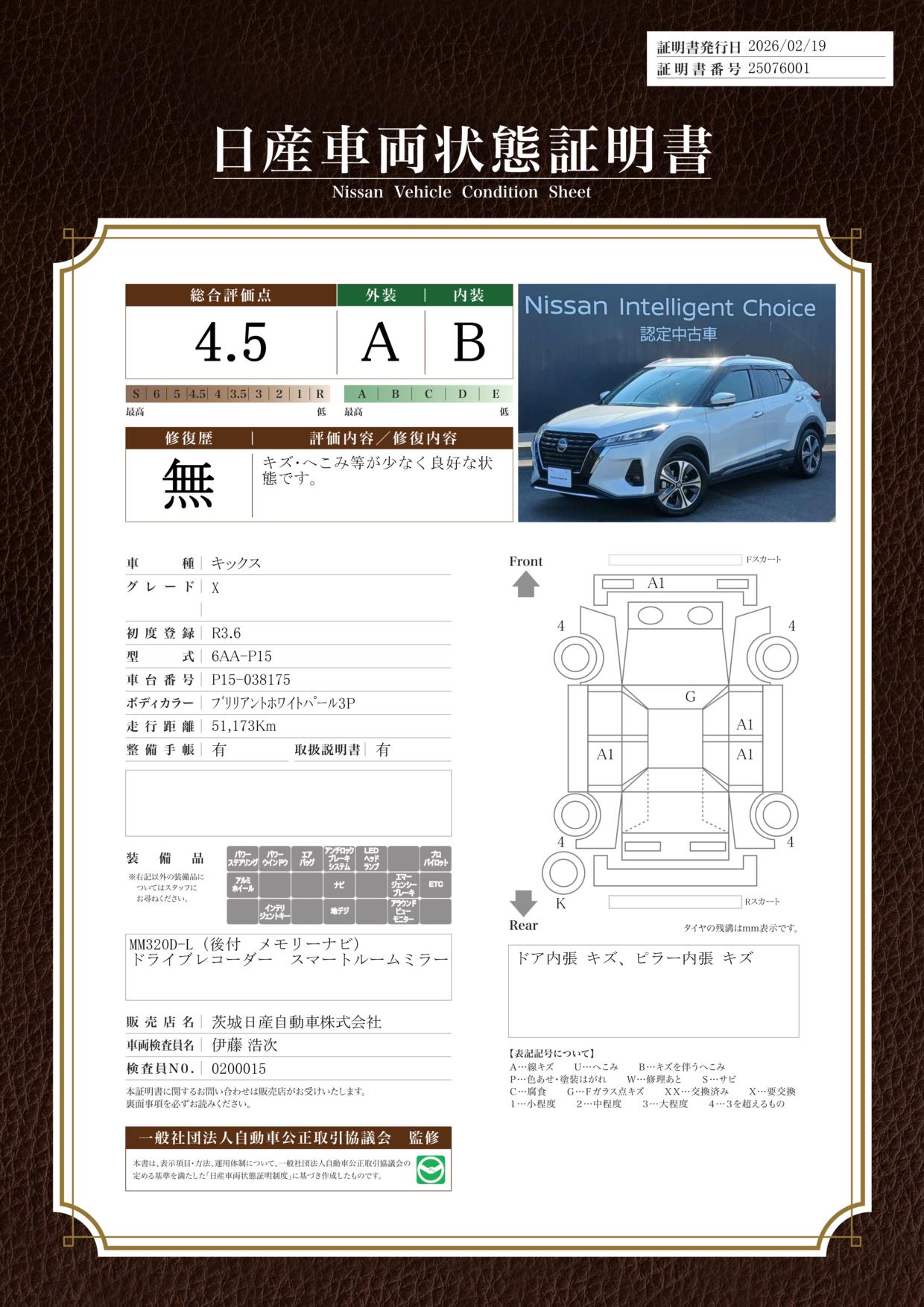 キックス 1200cc 1.2 X ツートーン インテリアエディション (e-POWER) 当社社有車/9インチナビ/アラウンドモニタ