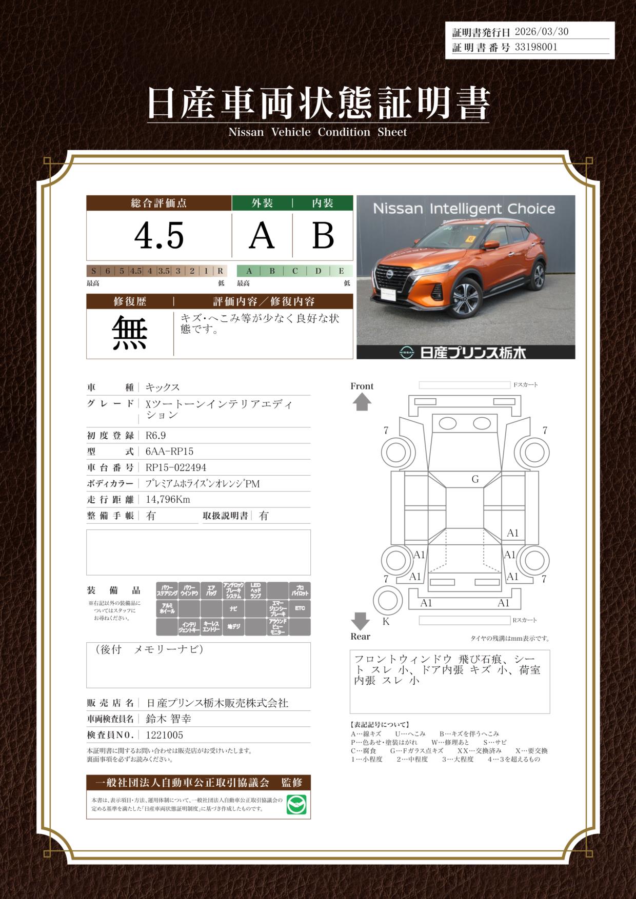 「車両状態証明書」は、査定協会監修のプロの検査員が公正かつ確かな基準で検査した”安心の証”です。