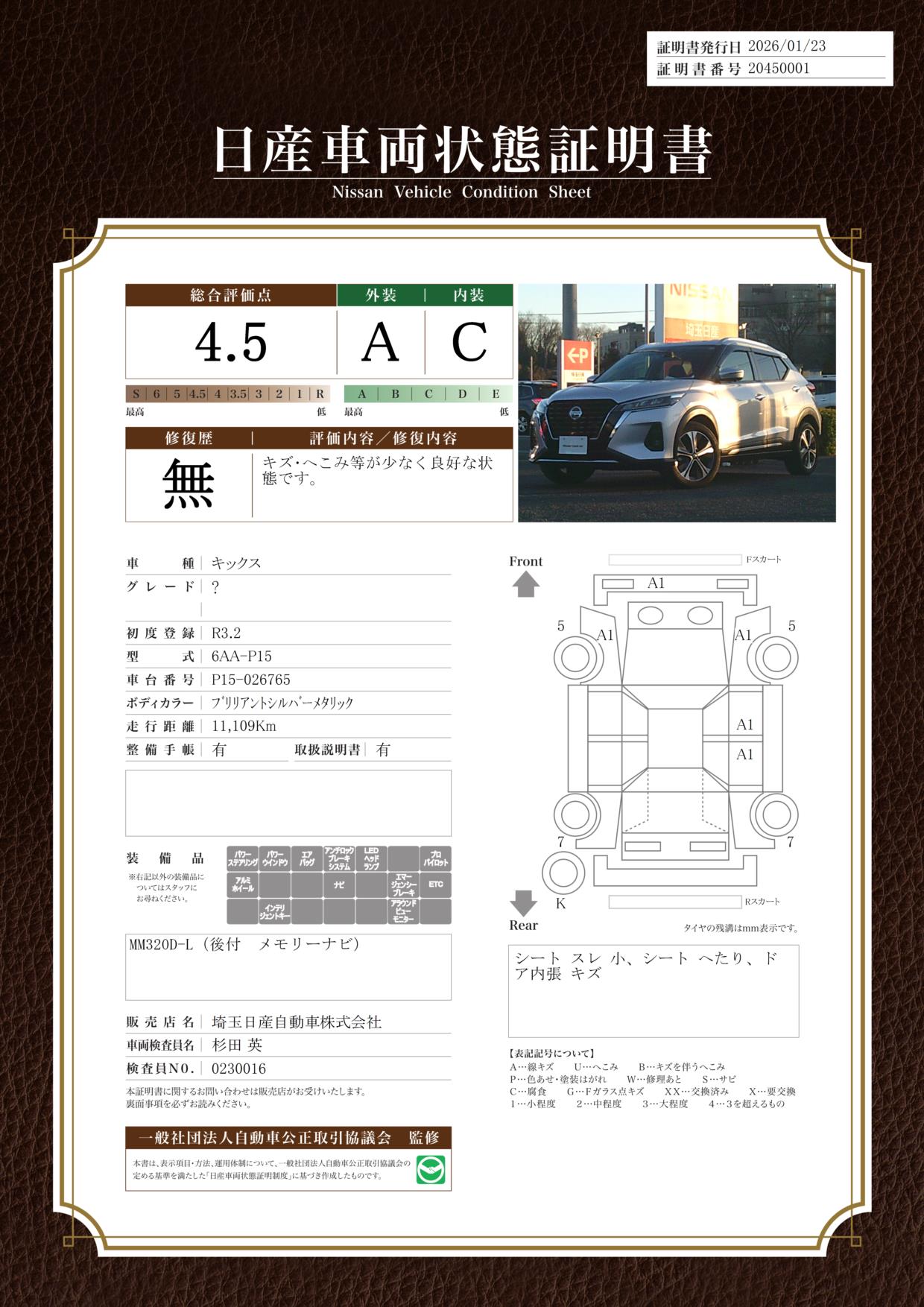 現状括弧書き内の年月まで車検有効期限が残っていますが、ご成約時に新しく車検を取り直します。なお取り直しの費用は車両価格に含まれています。