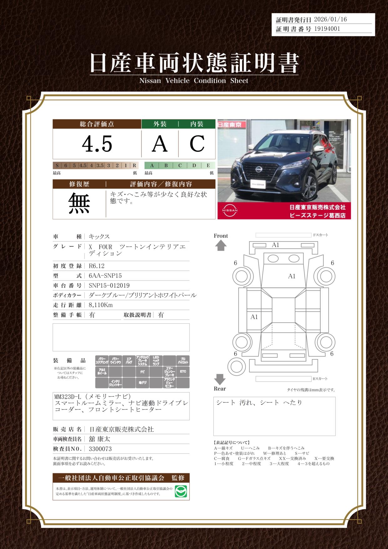 現状括弧書き内の年月まで車検有効期限が残っていますが、ご成約時に新しく車検を取り直します。なお取り直しの費用は車両価格に含まれています。