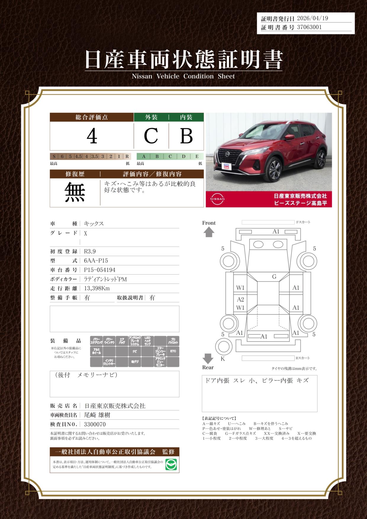 キックス 1200cc 1.2 X (e-POWER) 純正メモリーナビ SOSコール