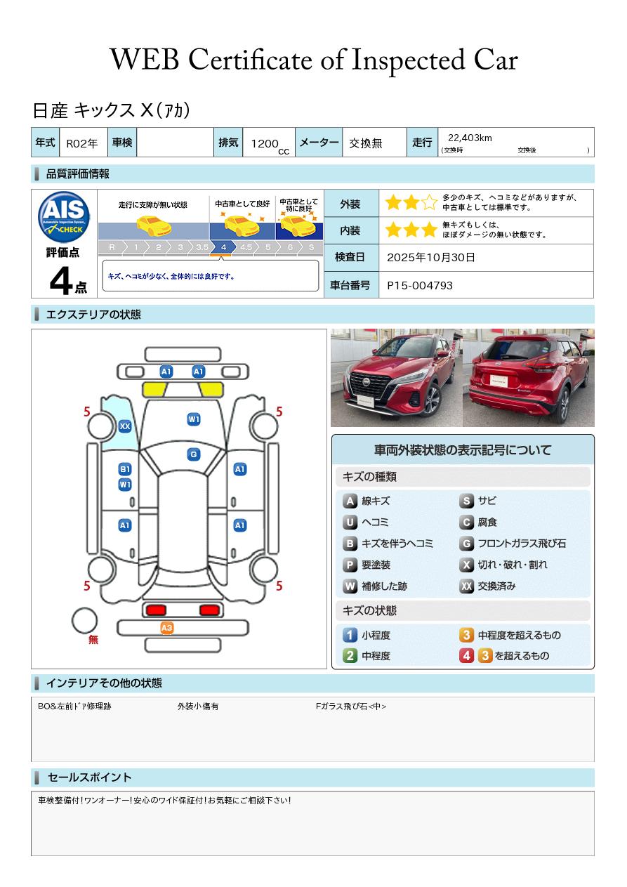 現状括弧書き内の年月まで車検有効期限が残っていますが、ご成約時に新しく車検を取り直します。なお取り直しの費用は車両価格に含まれています。
