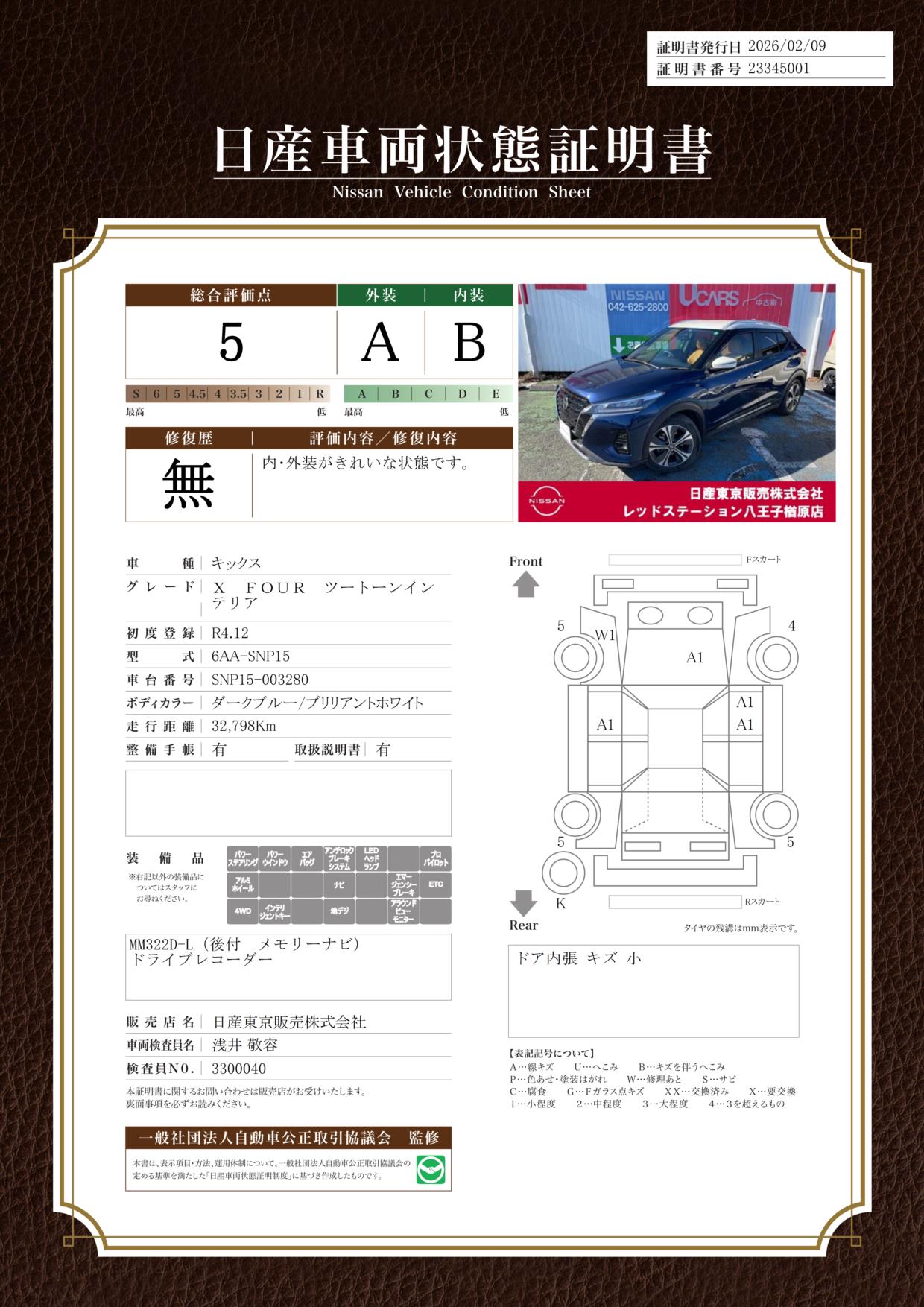 現状車検切れの状態ですが、ご成約時に新しく車検を実施します。車検費用は車両価格に含まれています。