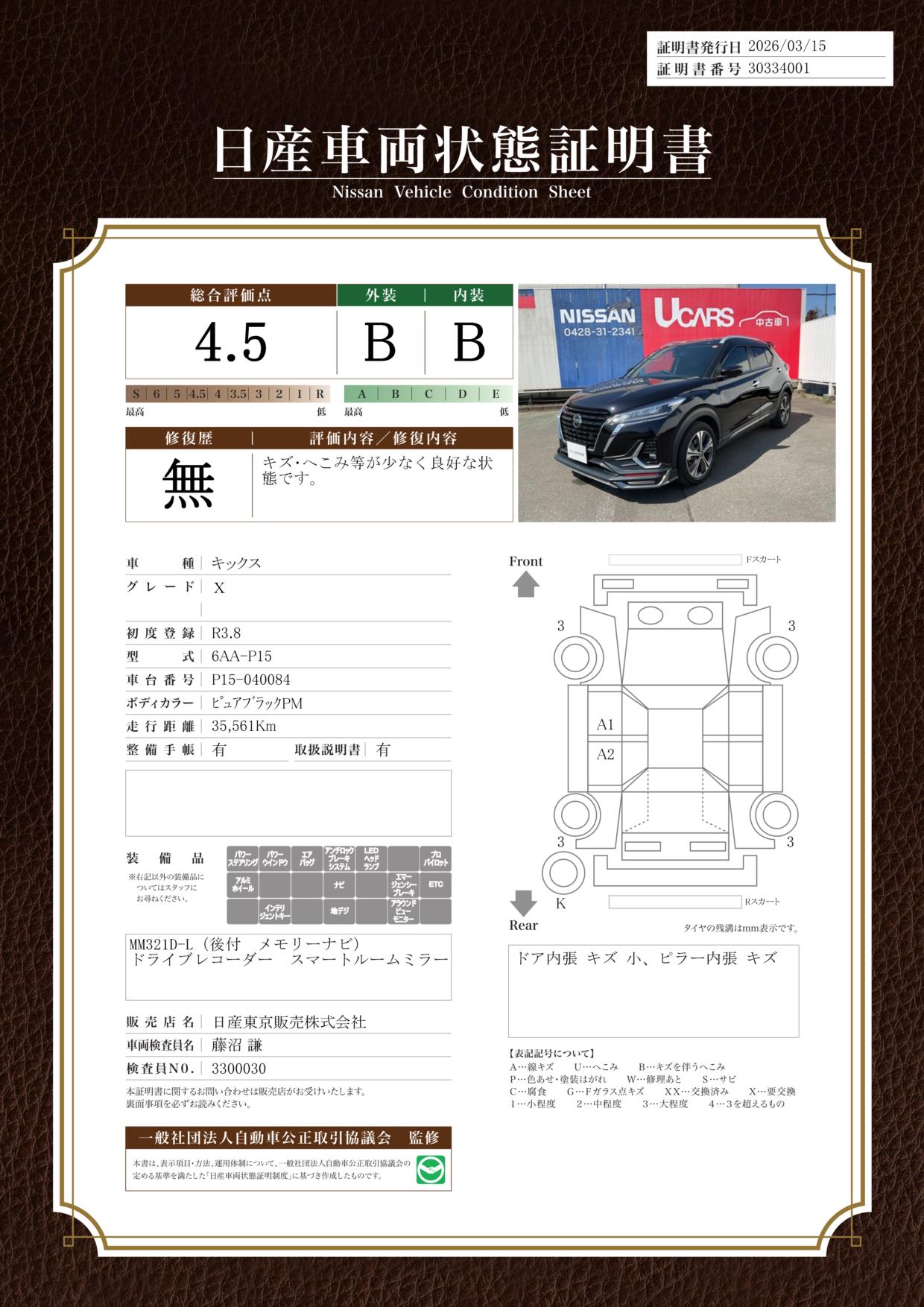 「車両状態証明書」は、査定協会監修のプロの検査員が公正かつ確かな基準で検査した”安心の証”です。