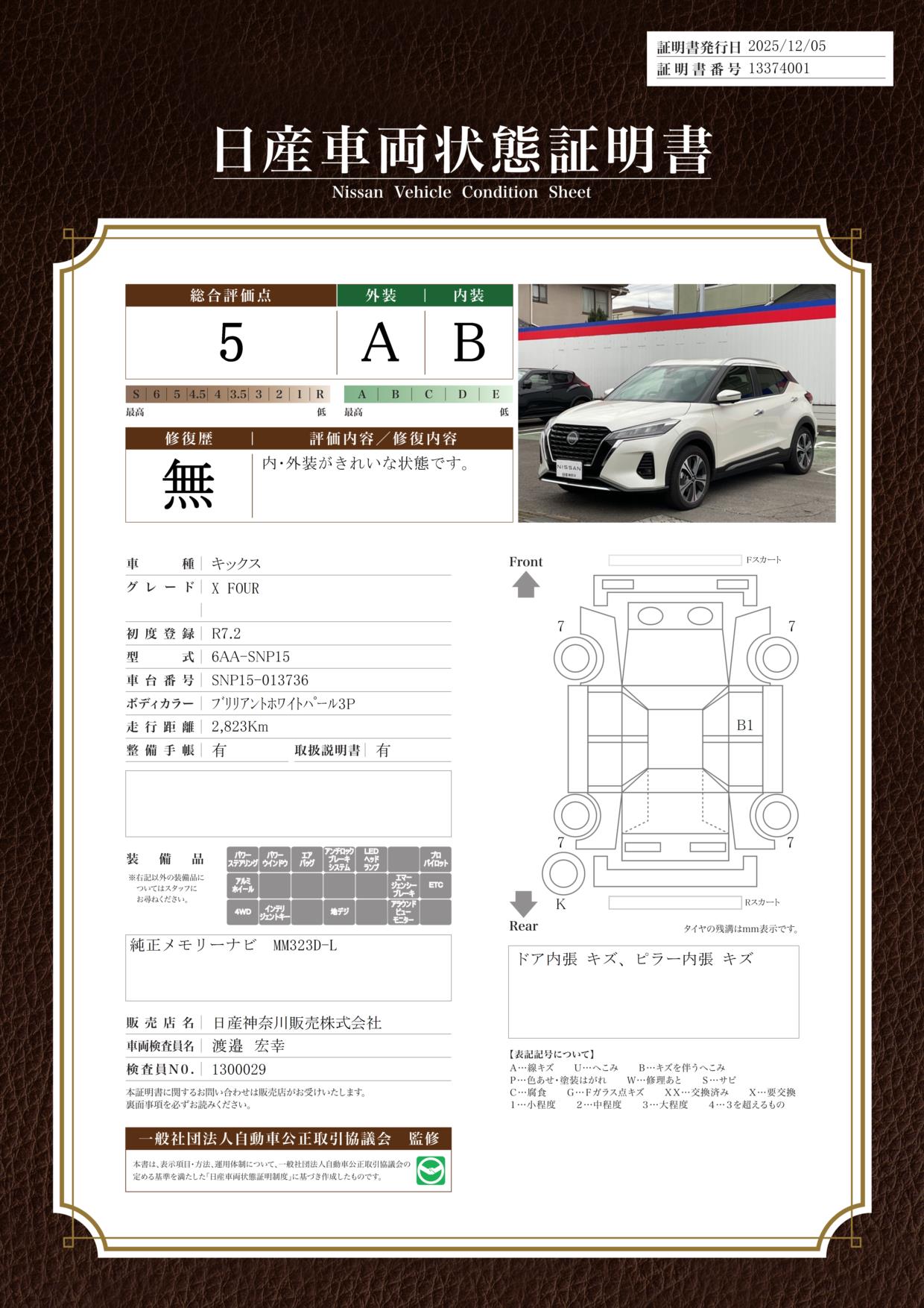 キックス 1200cc 1.2 X FOUR (e-POWER) 4WD 弊社展示試乗車 メモリーナビ ETC