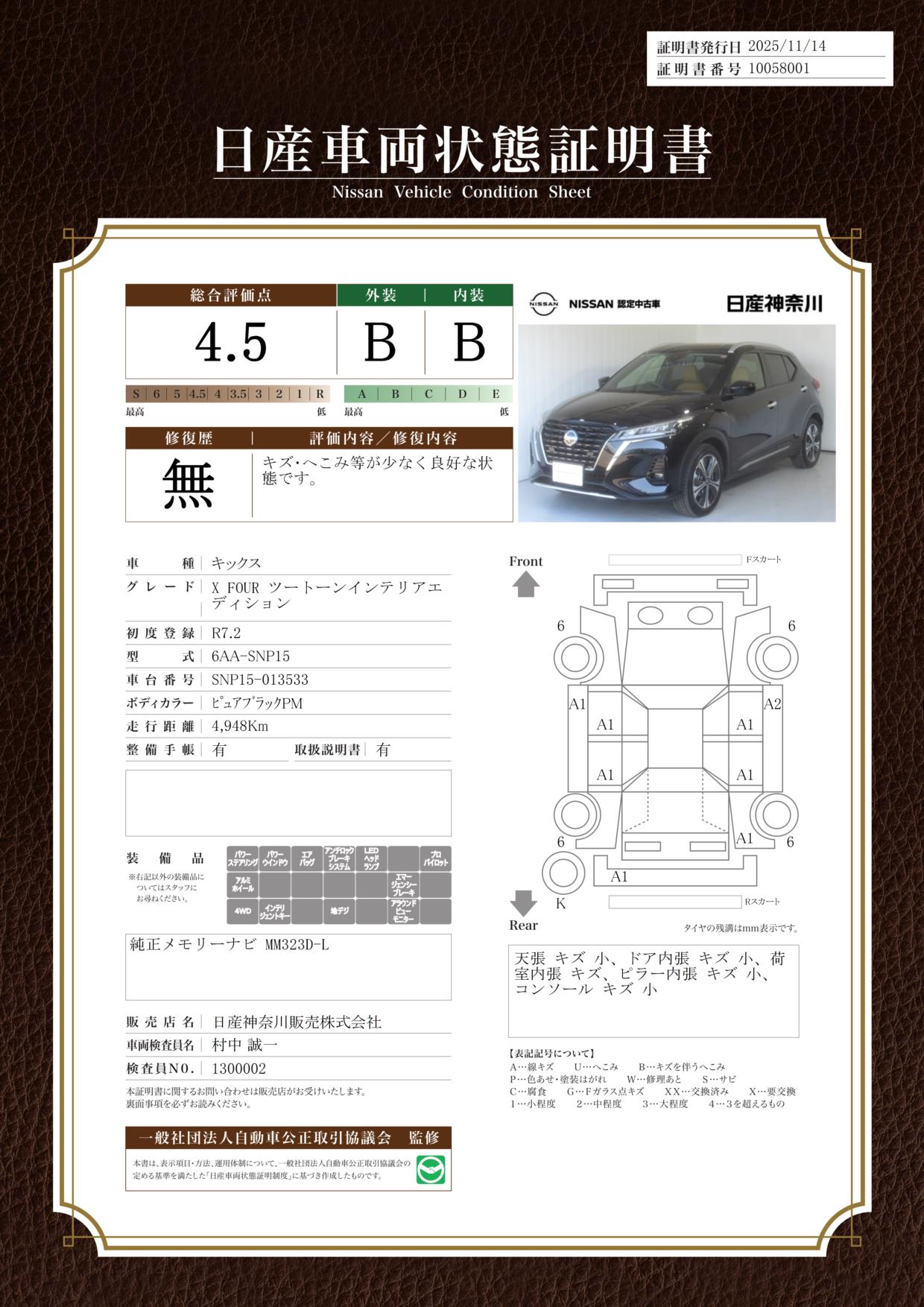 キックス 1200cc 1.2 X FOUR (e-POWER) 4WD 弊社展示試乗車 メモリーナビ ETC
