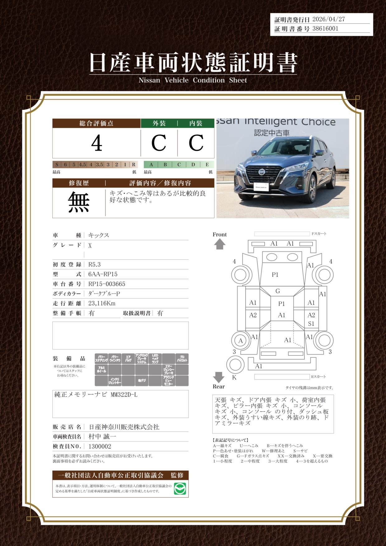 現状括弧書き内の年月まで車検有効期限が残っていますが、ご成約時に新しく車検を取り直します。なお取り直しの費用は車両価格に含まれています。