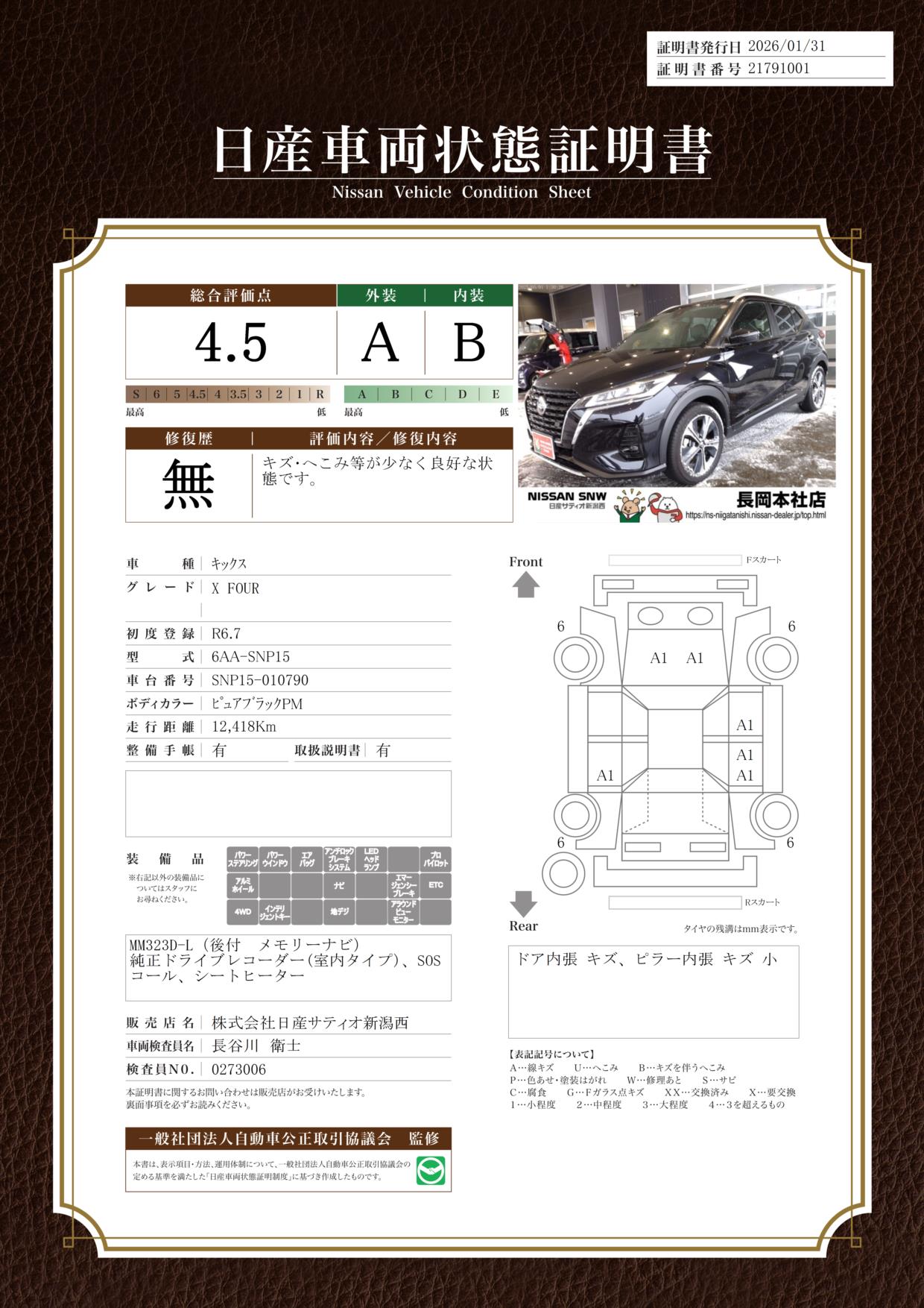 評価機関 : 日産車両状態証明