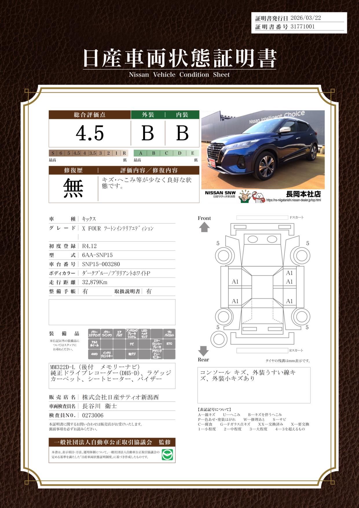 「車両状態証明書」は、査定協会監修のプロの検査員が公正かつ確かな基準で検査した”安心の証”です。