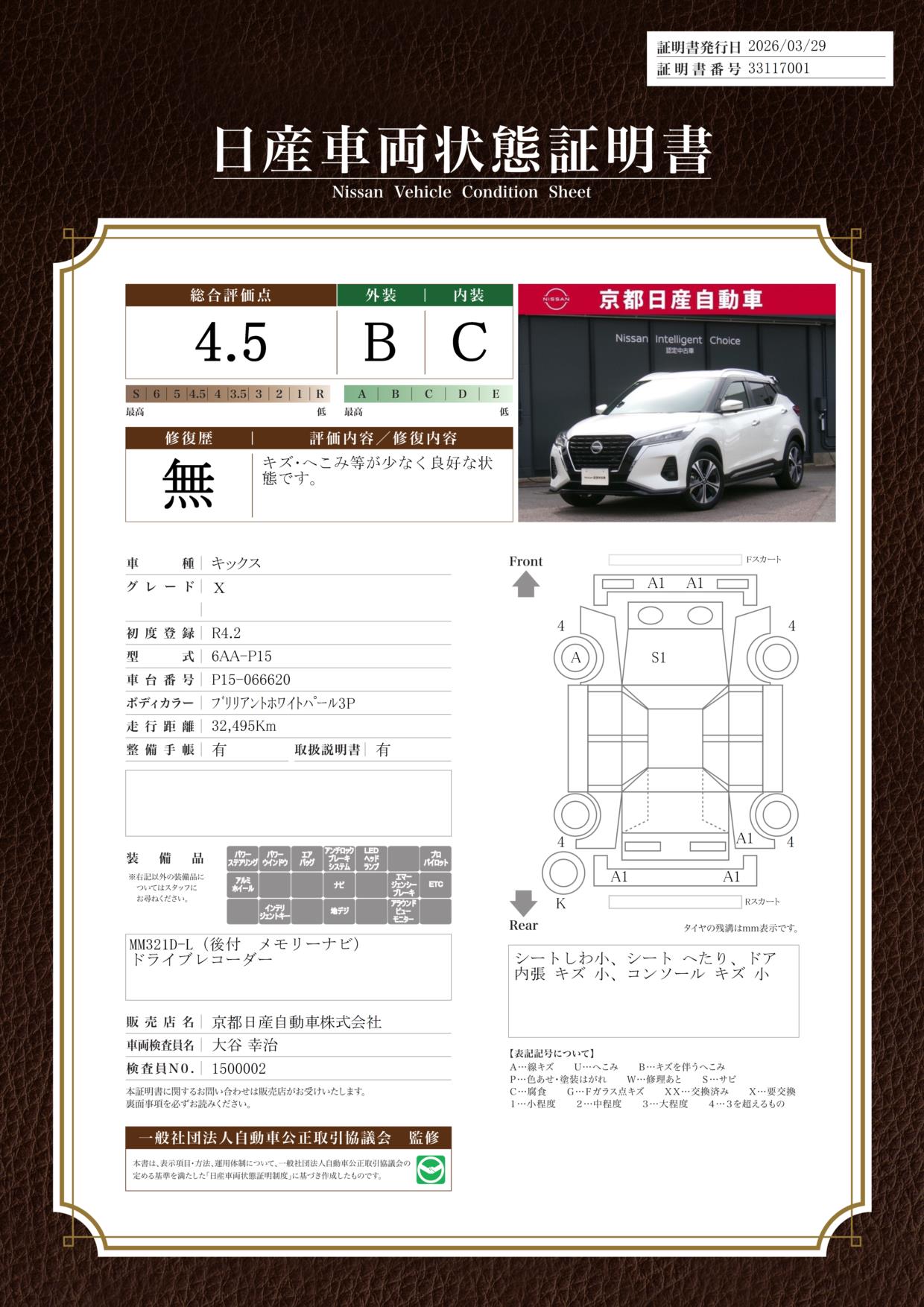 「車両状態証明書」は、査定協会監修のプロの検査員が公正かつ確かな基準で検査した”安心の証”です。