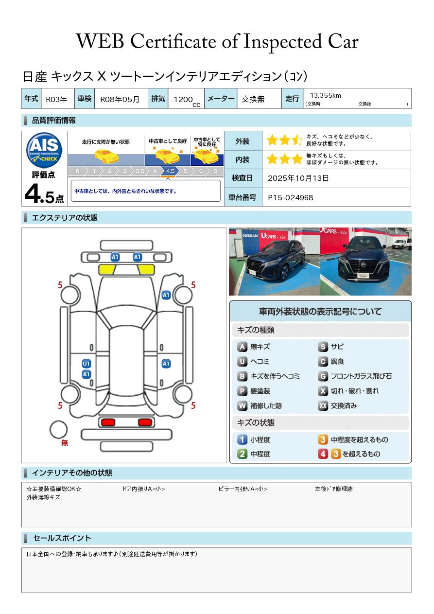 キックス 1200cc 1.2 X (e-POWER) 当社元試乗車&メモリーナビ&フルセグ