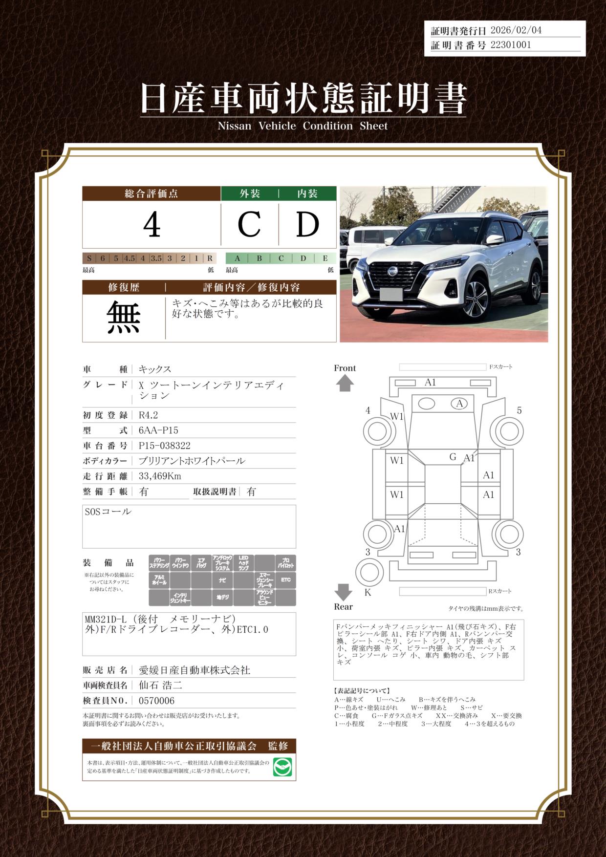 キックス 1200cc 1.2 X ツートーン インテリアエディション (e-POWER) 日産純正OPナビMM317D-W AVM