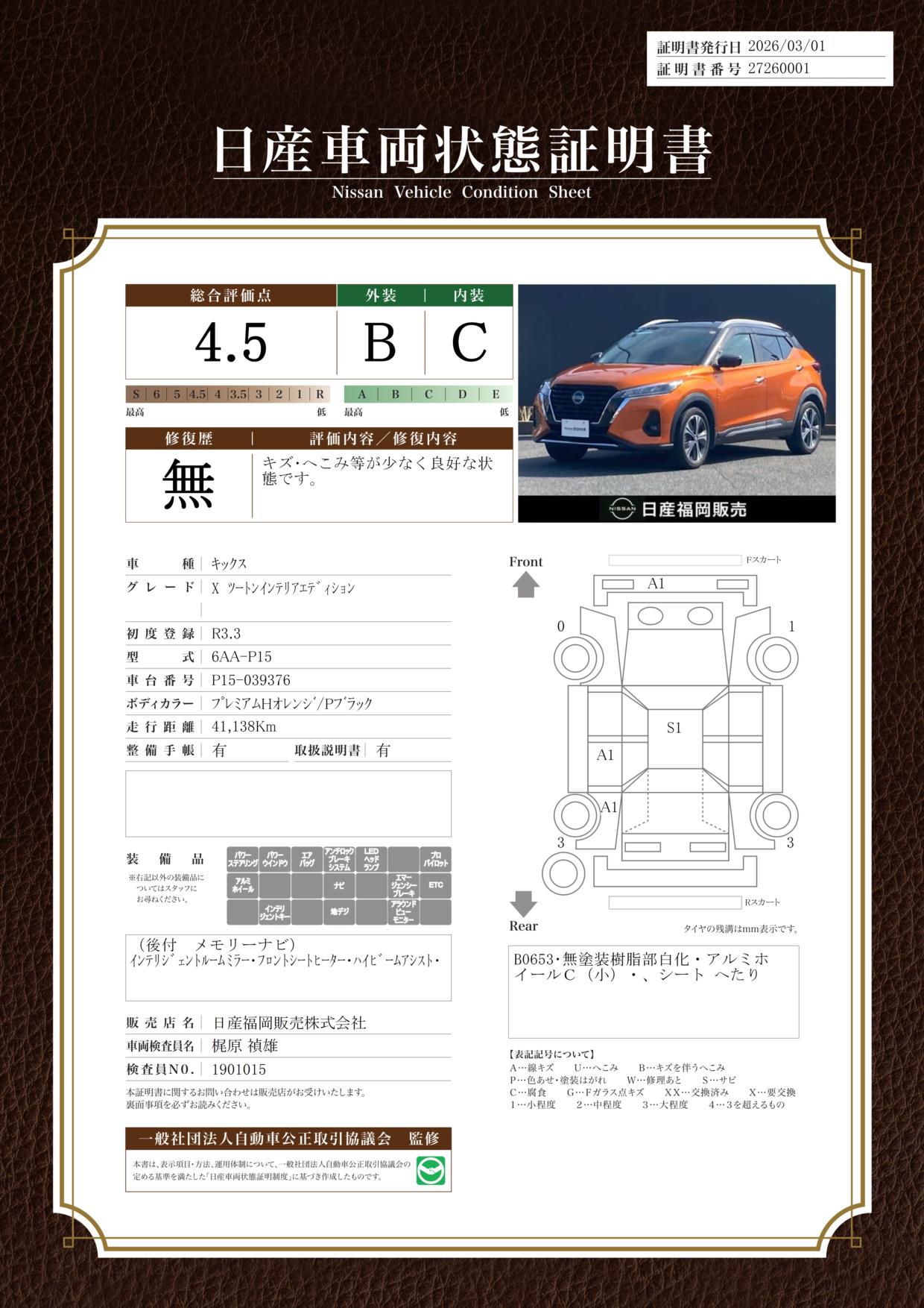 現状括弧書き内の年月まで車検有効期限が残っていますが、ご成約時に新しく車検を取り直します。なお取り直しの費用は車両価格に含まれています。