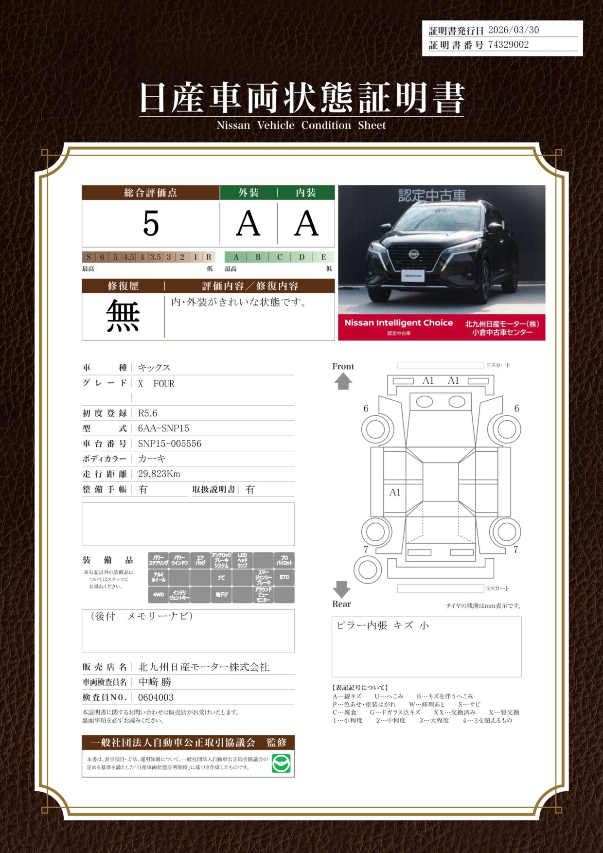 「車両状態証明書」は、査定協会監修のプロの検査員が公正かつ確かな基準で検査した”安心の証”です。