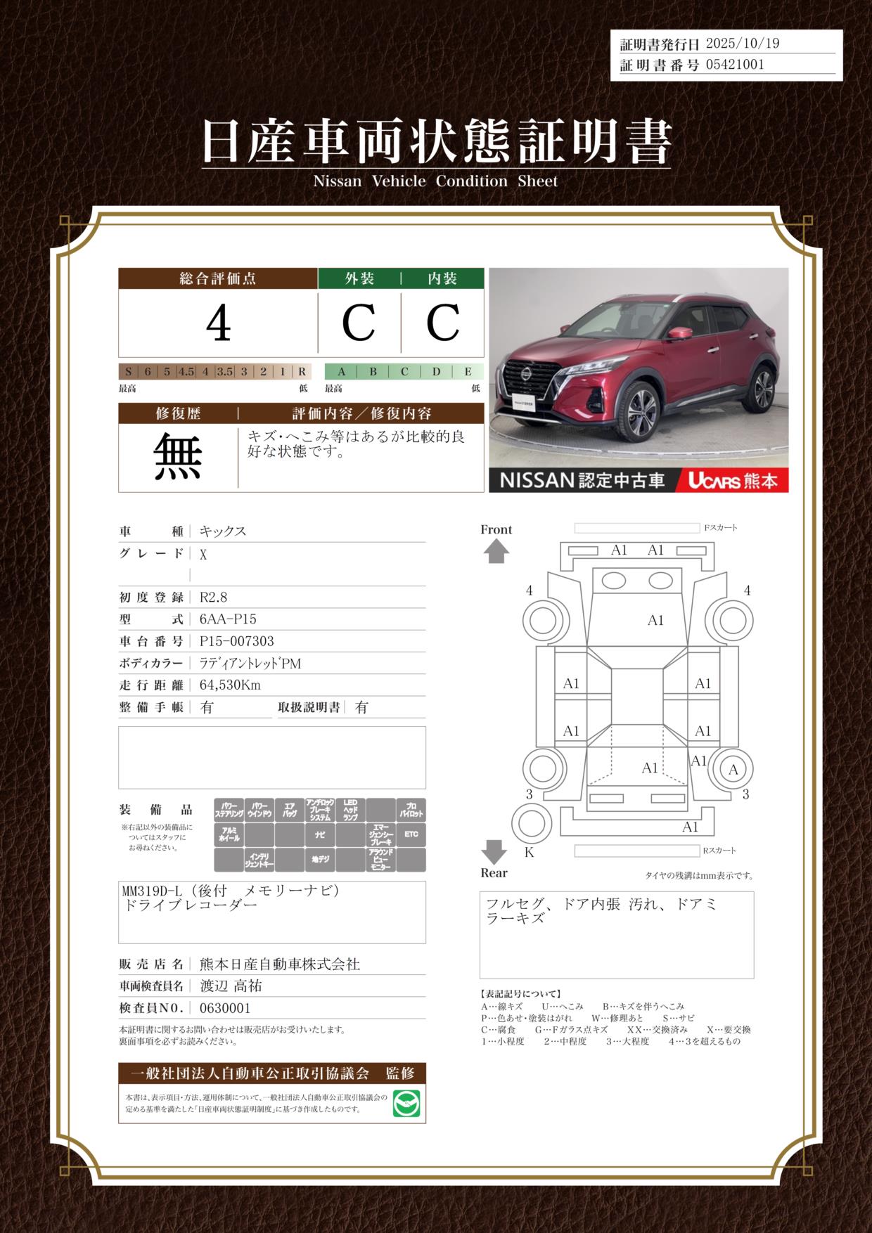 現状括弧書き内の年月まで車検有効期限が残っていますが、ご成約時に新しく車検を取り直します。なお取り直しの費用は車両価格に含まれています。