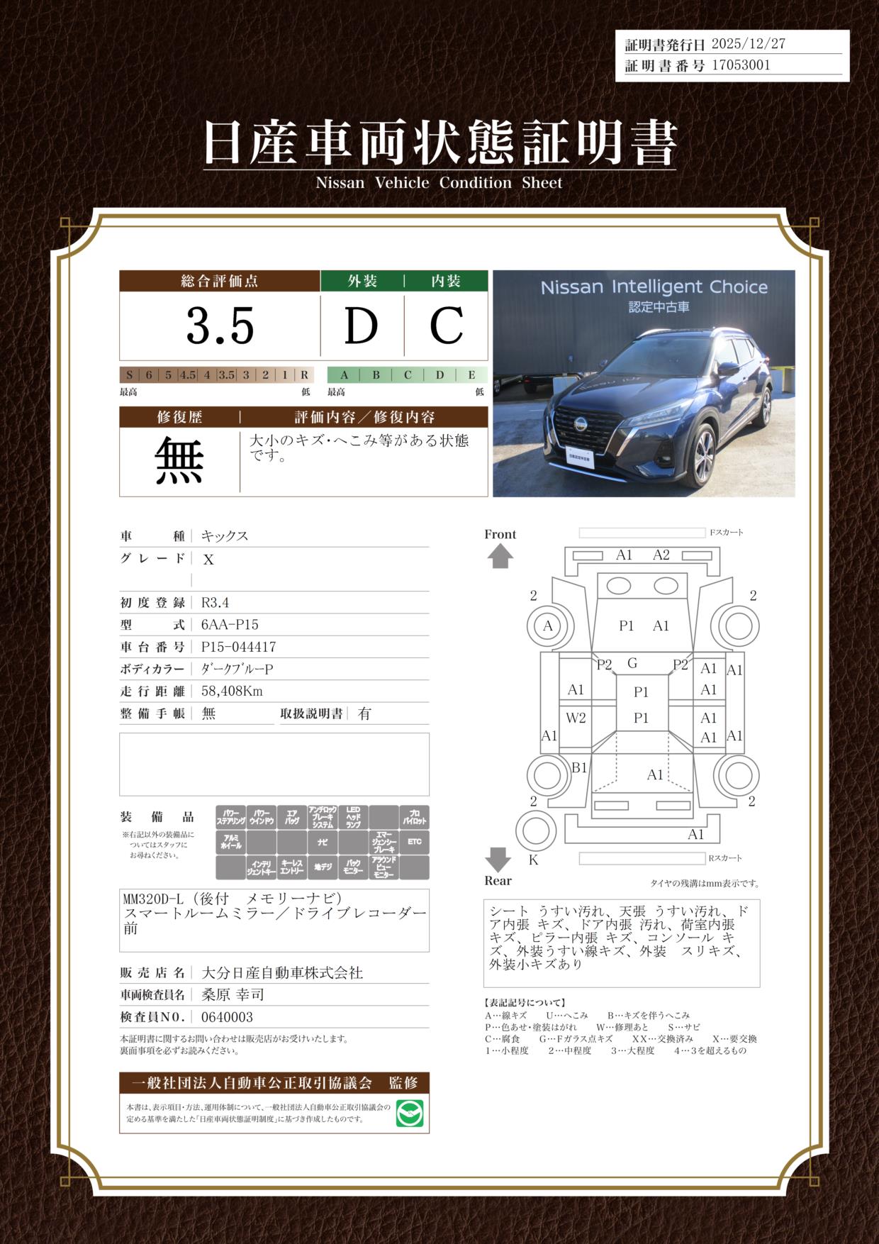 現状括弧書き内の年月まで車検有効期限が残っていますが、ご成約時に新しく車検を取り直します。なお取り直しの費用は車両価格に含まれています。
