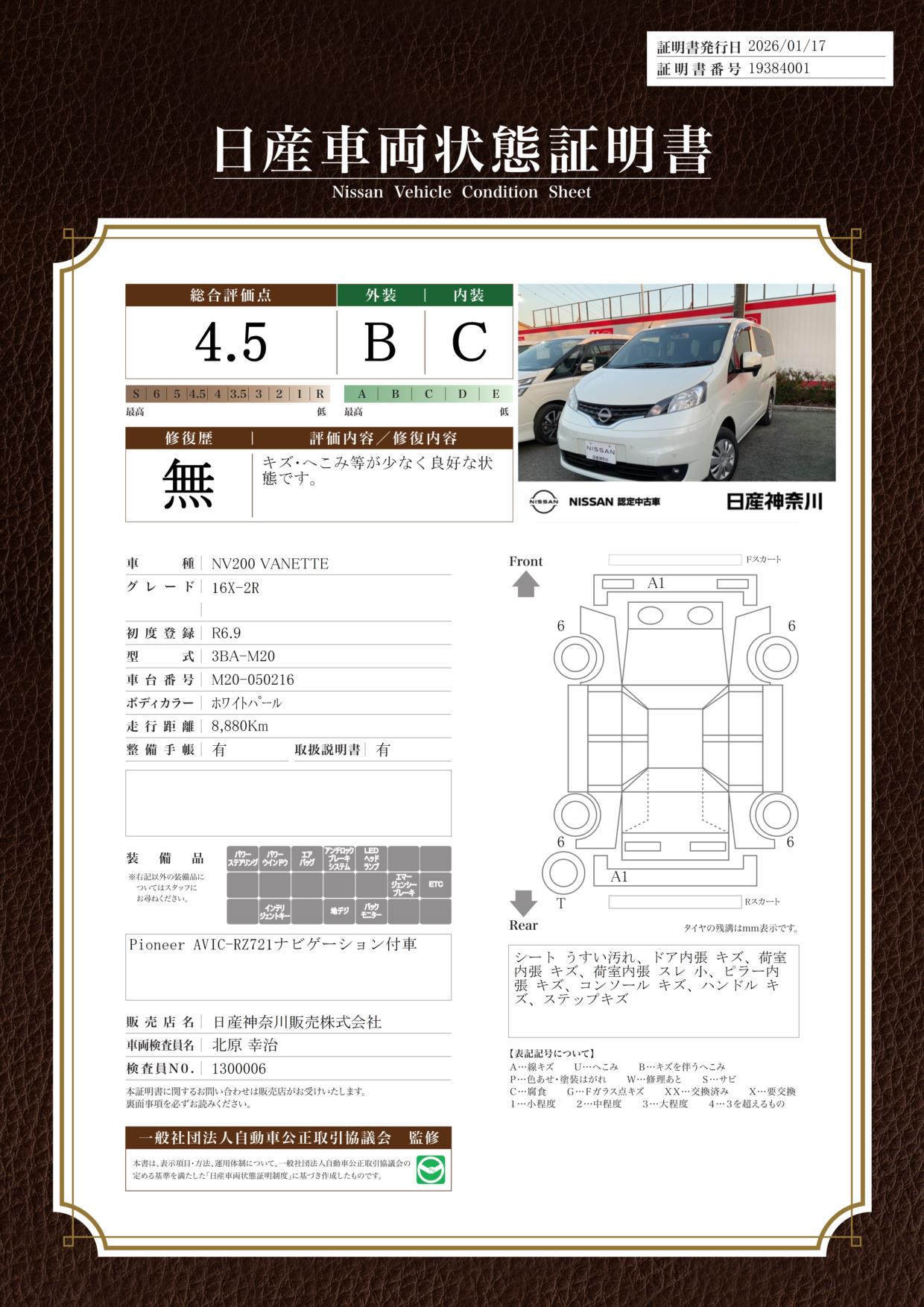 現状括弧書き内の年月まで車検有効期限が残っていますが、ご成約時に新しく車検を取り直します。なお取り直しの費用は車両価格に含まれています。