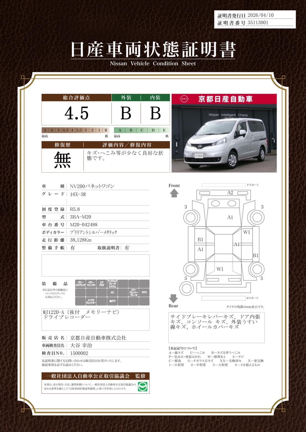 「車両状態証明書」は、査定協会監修のプロの検査員が公正かつ確かな基準で検査した”安心の証”です。