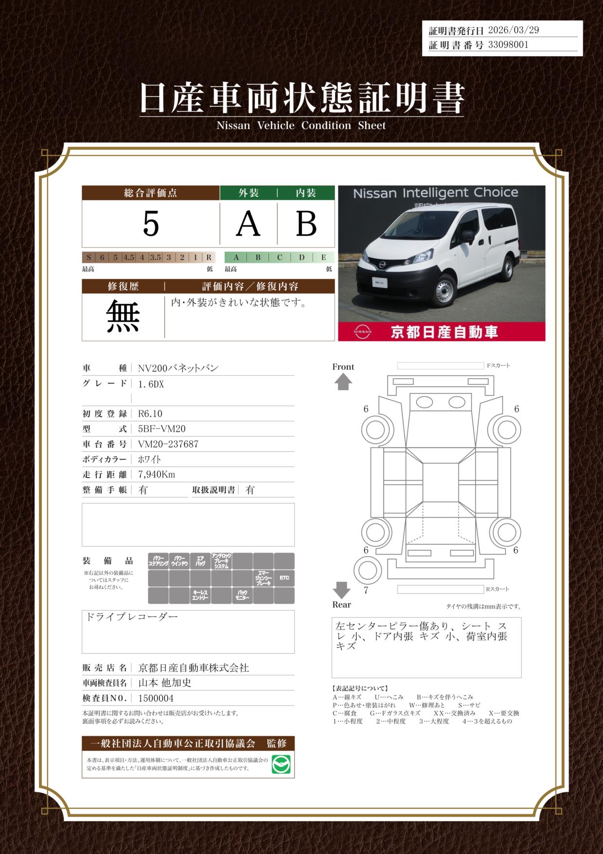 「車両状態証明書」は、査定協会監修のプロの検査員が公正かつ確かな基準で検査した”安心の証”です。