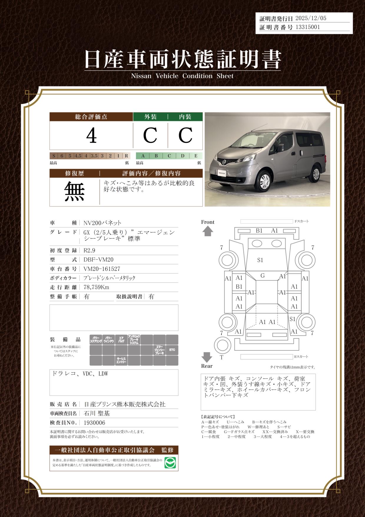 評価機関 : 日産車両状態証明