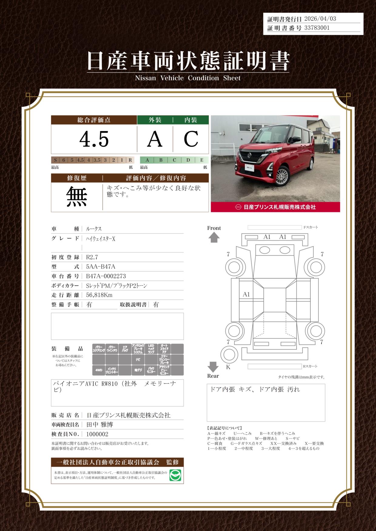 ルークス 660cc 660 ハイウェイスターX プロパイロット エディション 4WD 日産ディーラーオプション9インチナビ/アラ