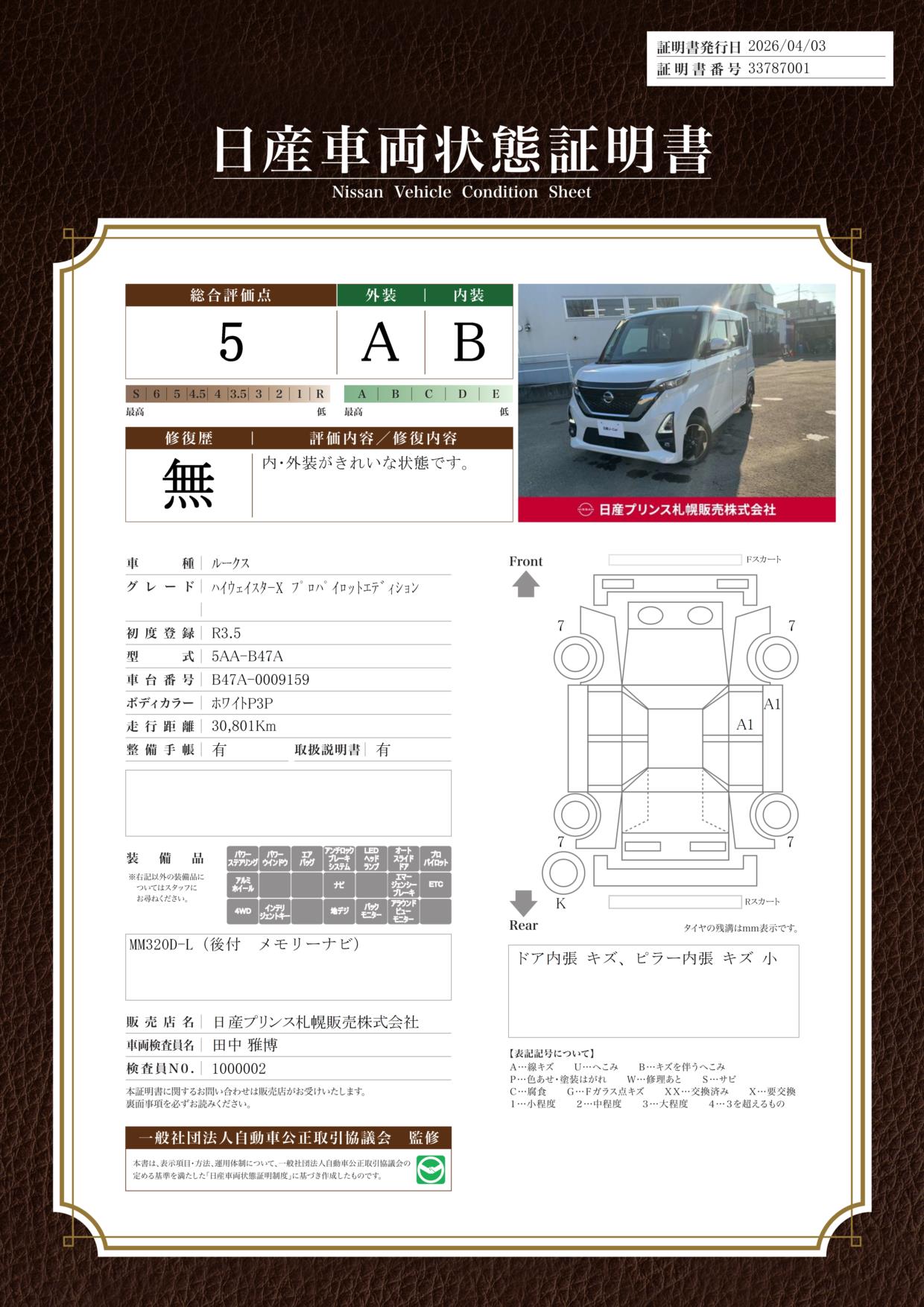 「車両状態証明書」は、査定協会監修のプロの検査員が公正かつ確かな基準で検査した”安心の証”です。