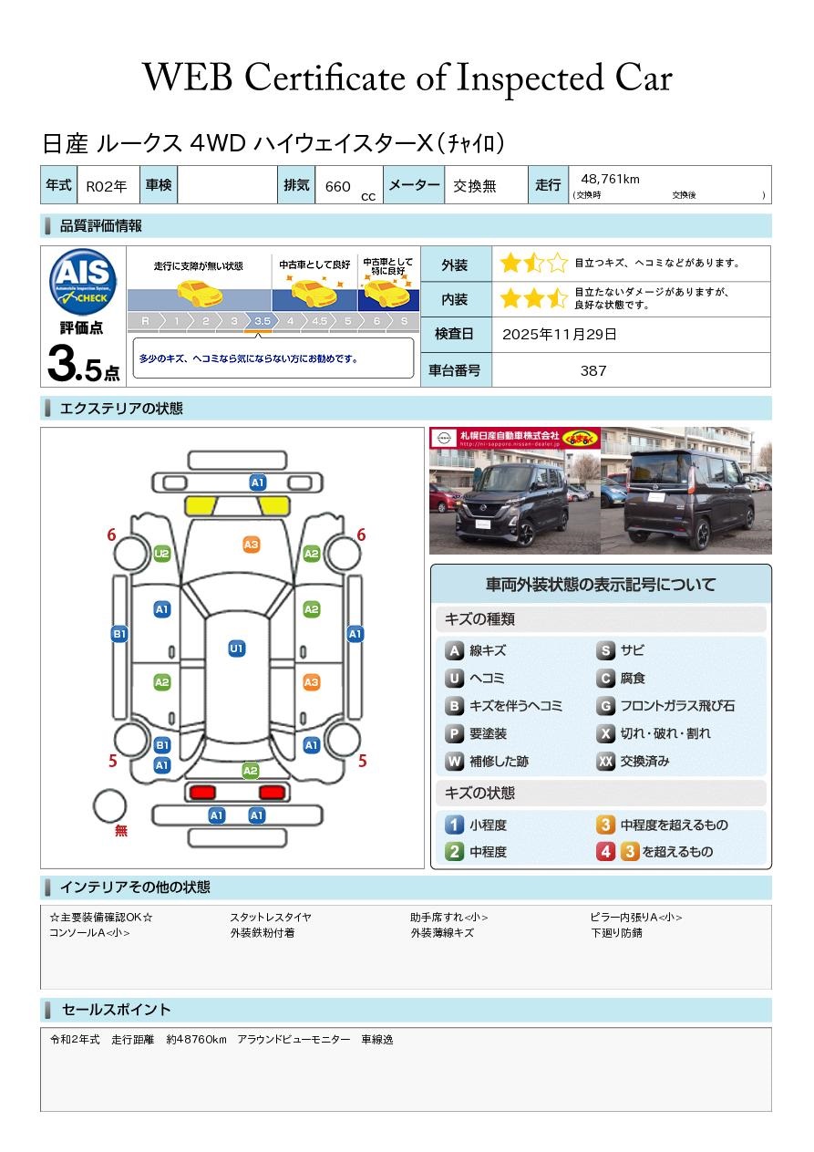 ルークス 660cc 660 ハイウェイスターX 4WD 低速衝突軽減ブレーキ横滑り防止装置アラウ
