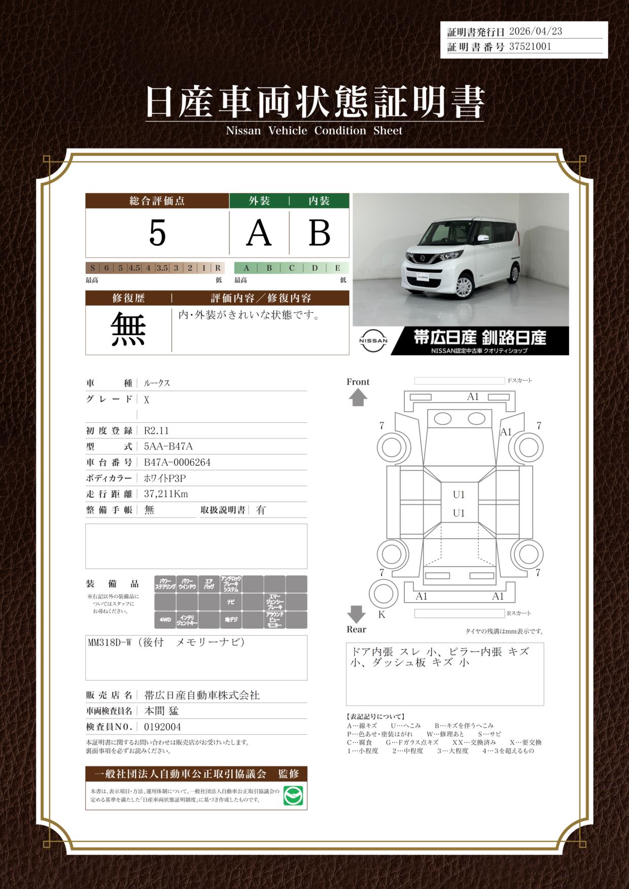 現状括弧書き内の年月まで車検有効期限が残っていますが、ご成約時に新しく車検を取り直します。なお取り直しの費用は車両価格に含まれています。