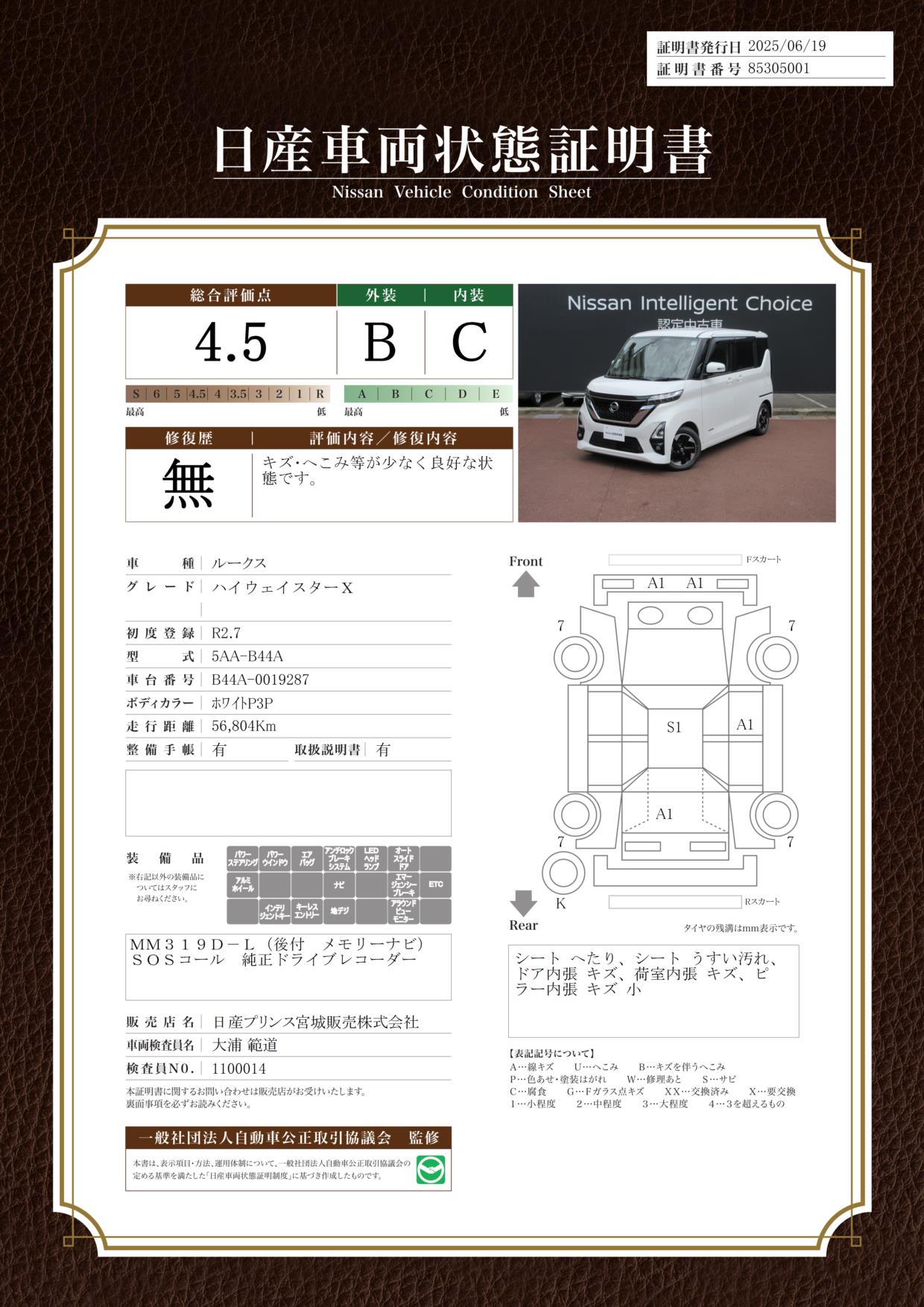 現状括弧書き内の年月まで車検有効期限が残っていますが、ご成約時に新しく車検を取り直します。なお取り直しの費用は車両価格に含まれています。