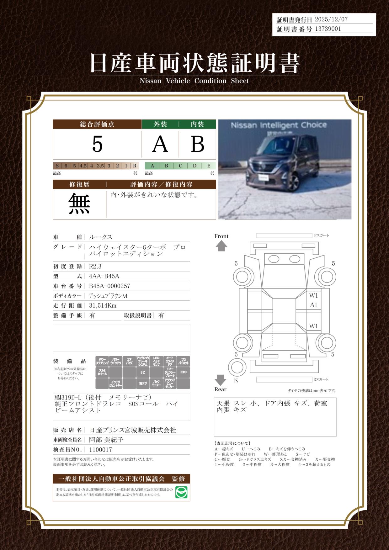 現状括弧書き内の年月まで車検有効期限が残っていますが、ご成約時に新しく車検を取り直します。なお取り直しの費用は車両価格に含まれています。