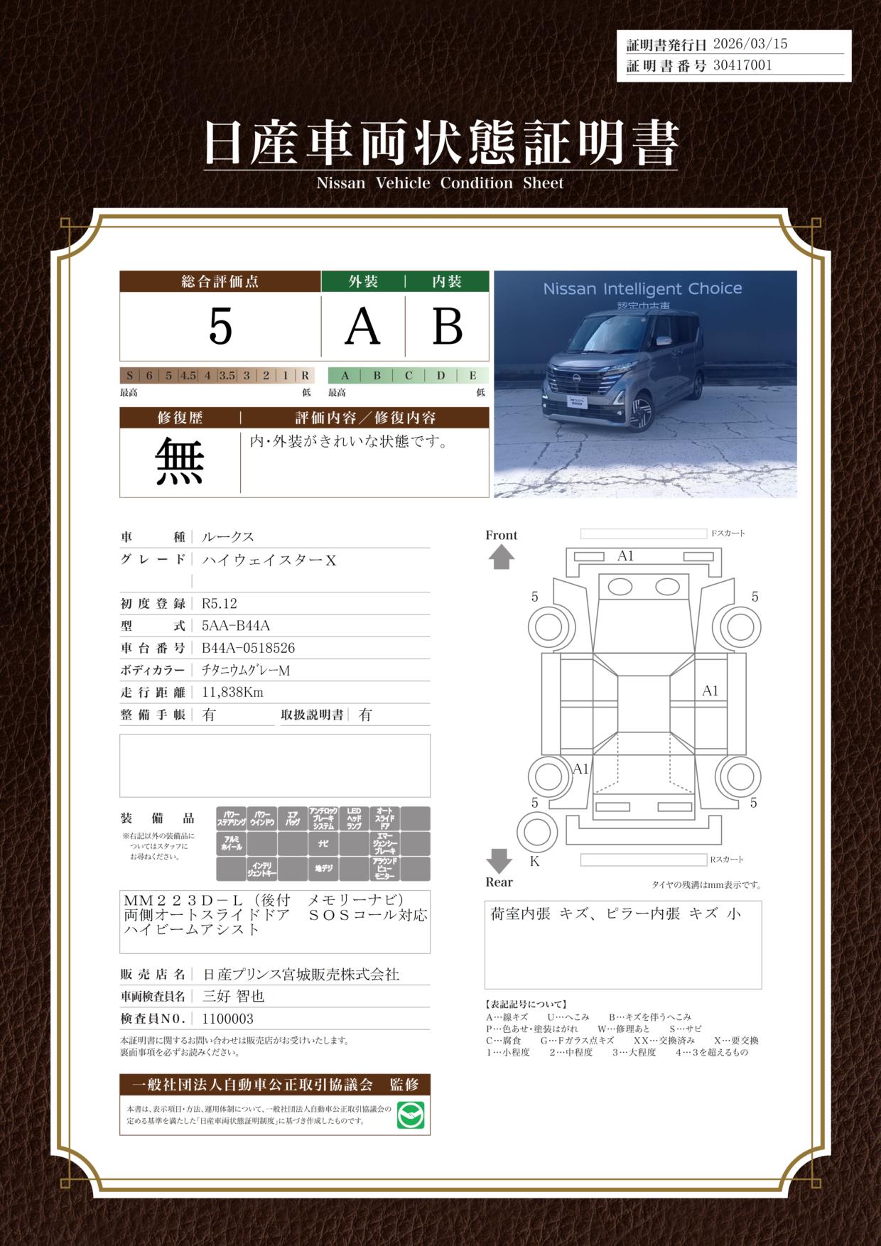 「車両状態証明書」は、査定協会監修のプロの検査員が公正かつ確かな基準で検査した”安心の証”です。