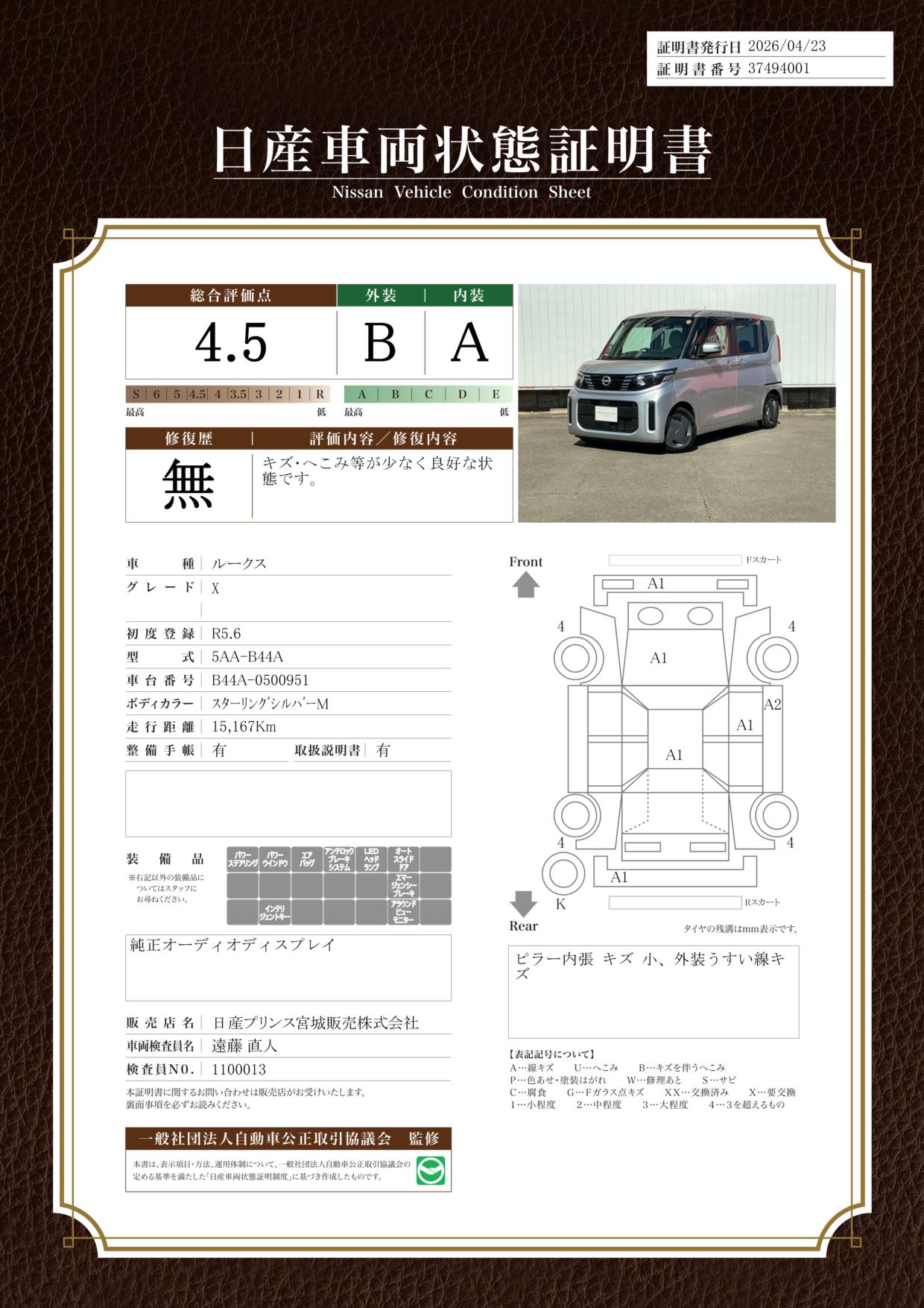 「車両状態証明書」は、査定協会監修のプロの検査員が公正かつ確かな基準で検査した”安心の証”です。