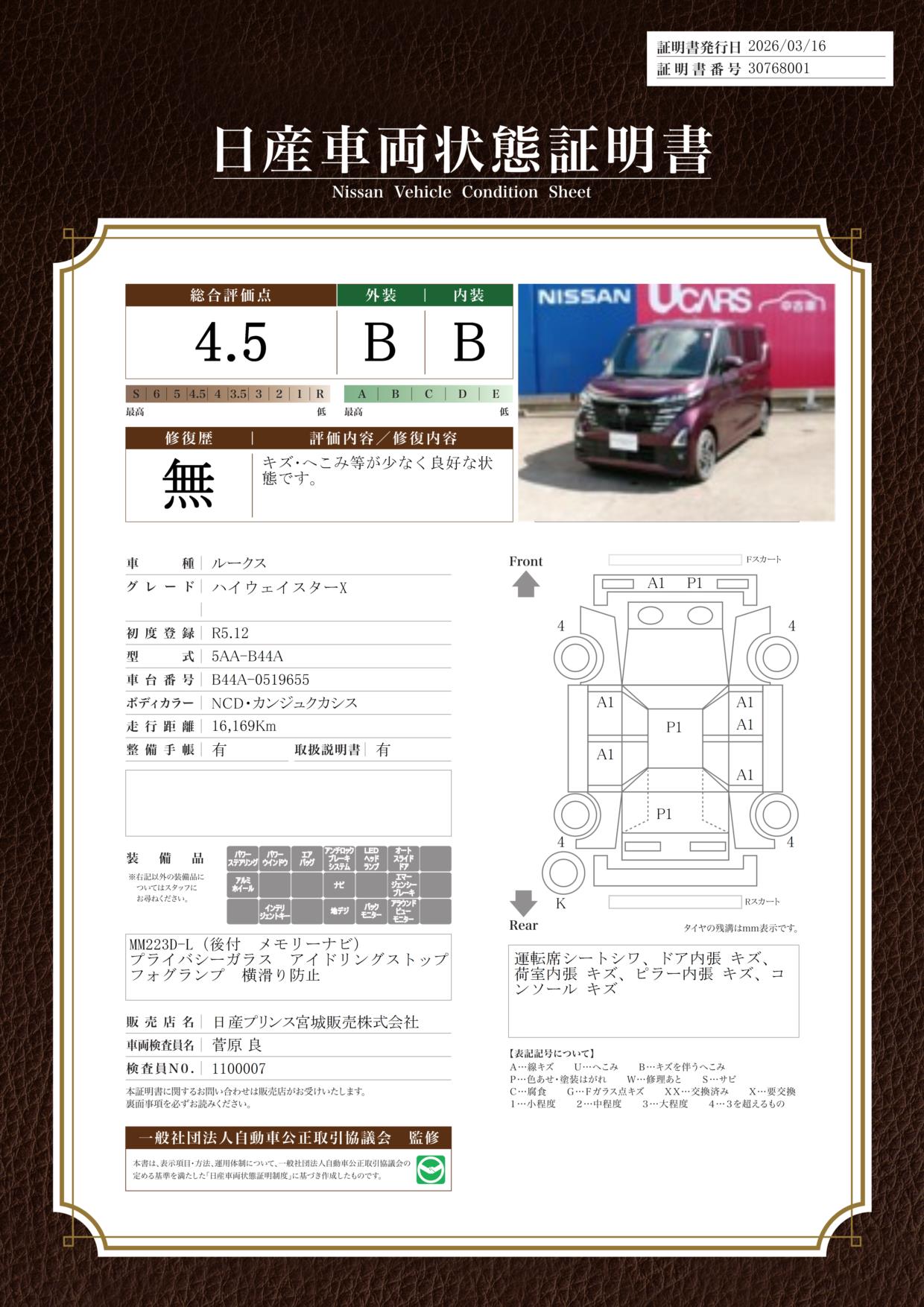 「車両状態証明書」は、査定協会監修のプロの検査員が公正かつ確かな基準で検査した”安心の証”です。