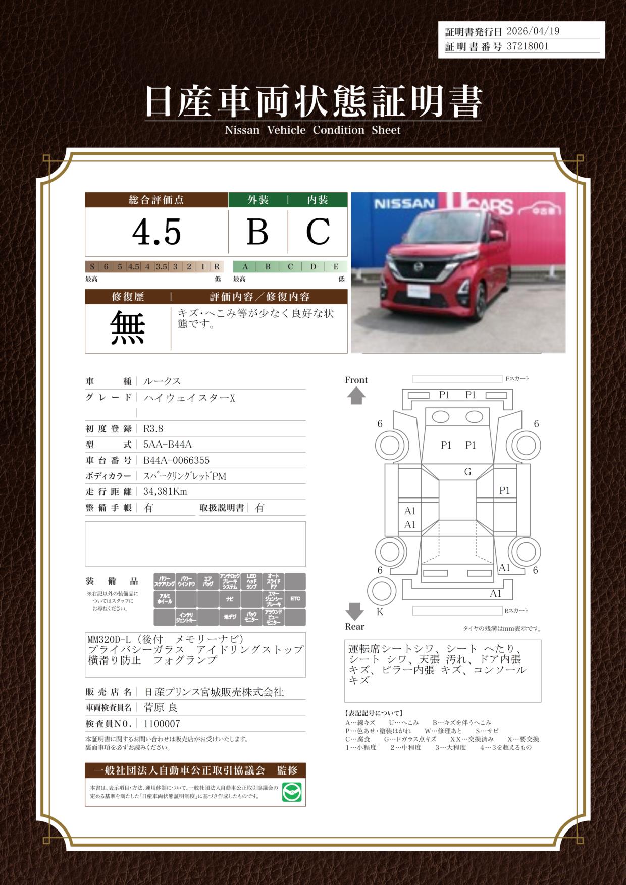 「車両状態証明書」は、査定協会監修のプロの検査員が公正かつ確かな基準で検査した”安心の証”です。