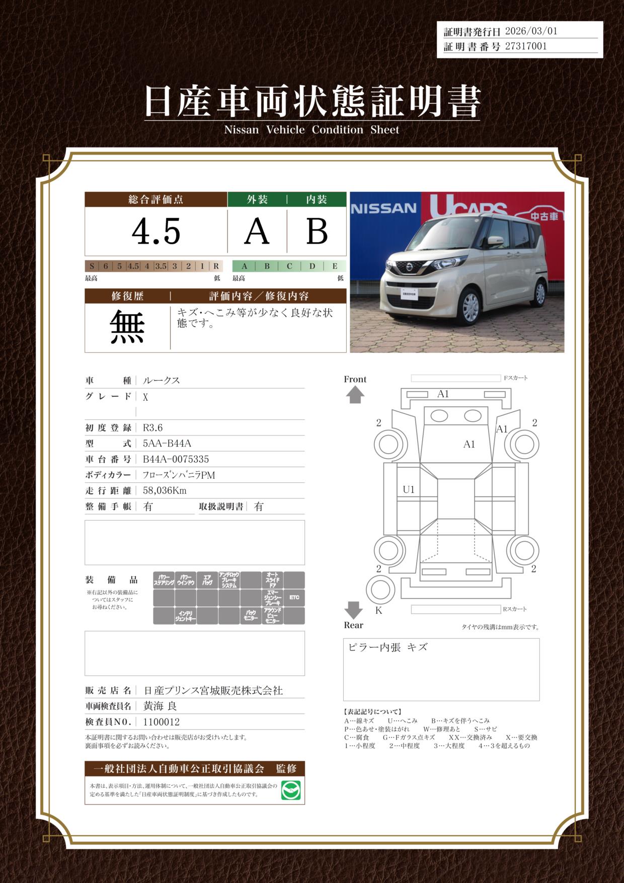 評価機関 : 日産車両状態証明