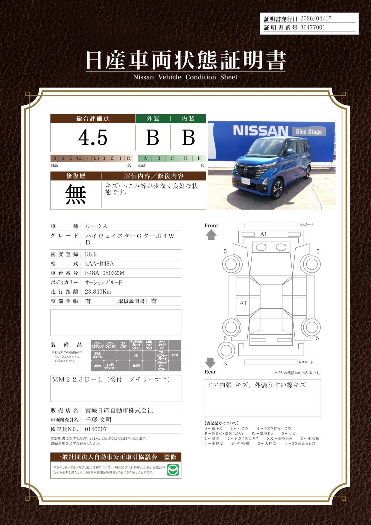 「車両状態証明書」は、査定協会監修のプロの検査員が公正かつ確かな基準で検査した”安心の証”です。