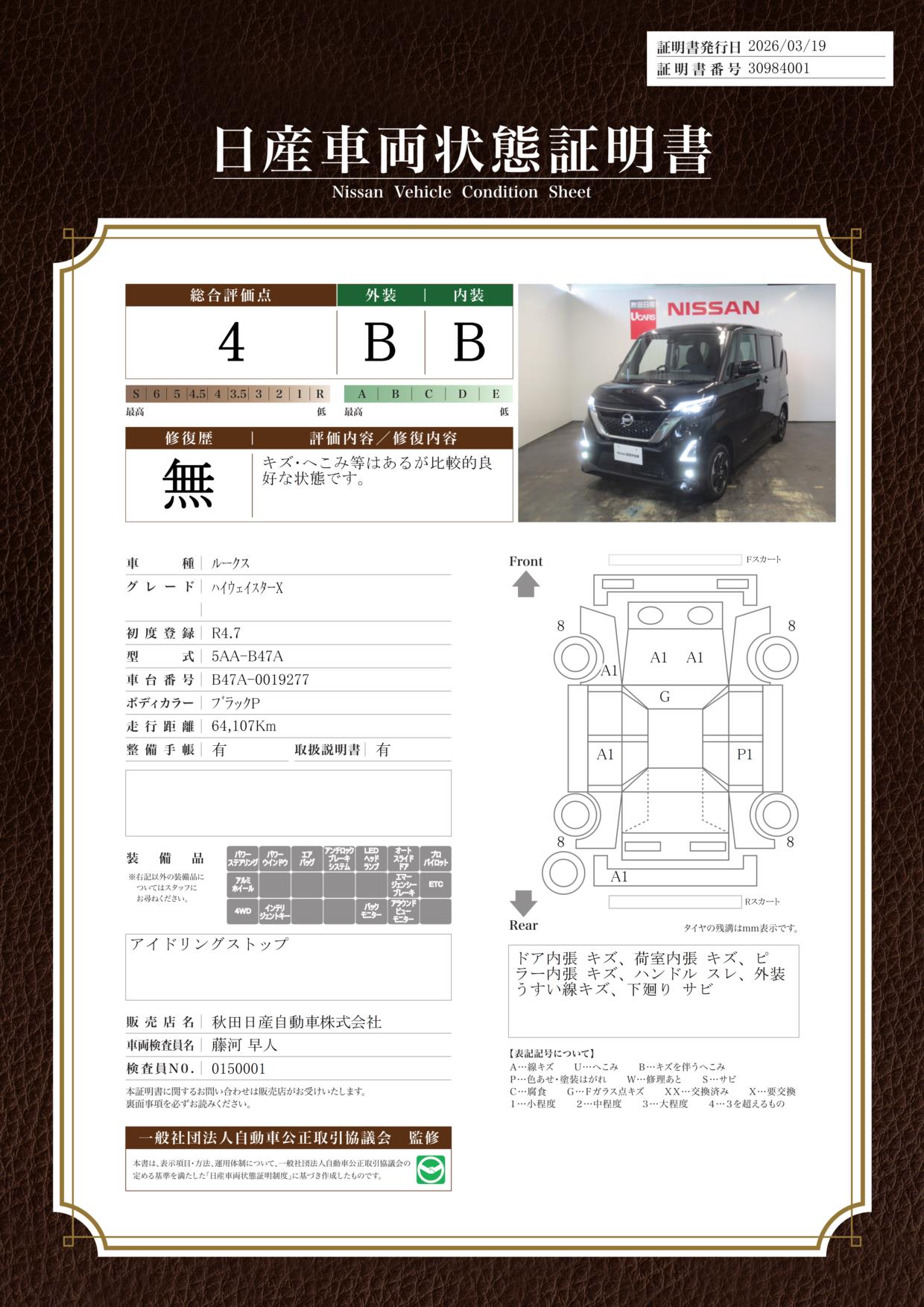 現状括弧書き内の年月まで車検有効期限が残っていますが、ご成約時に新しく車検を取り直します。なお取り直しの費用は車両価格に含まれています。