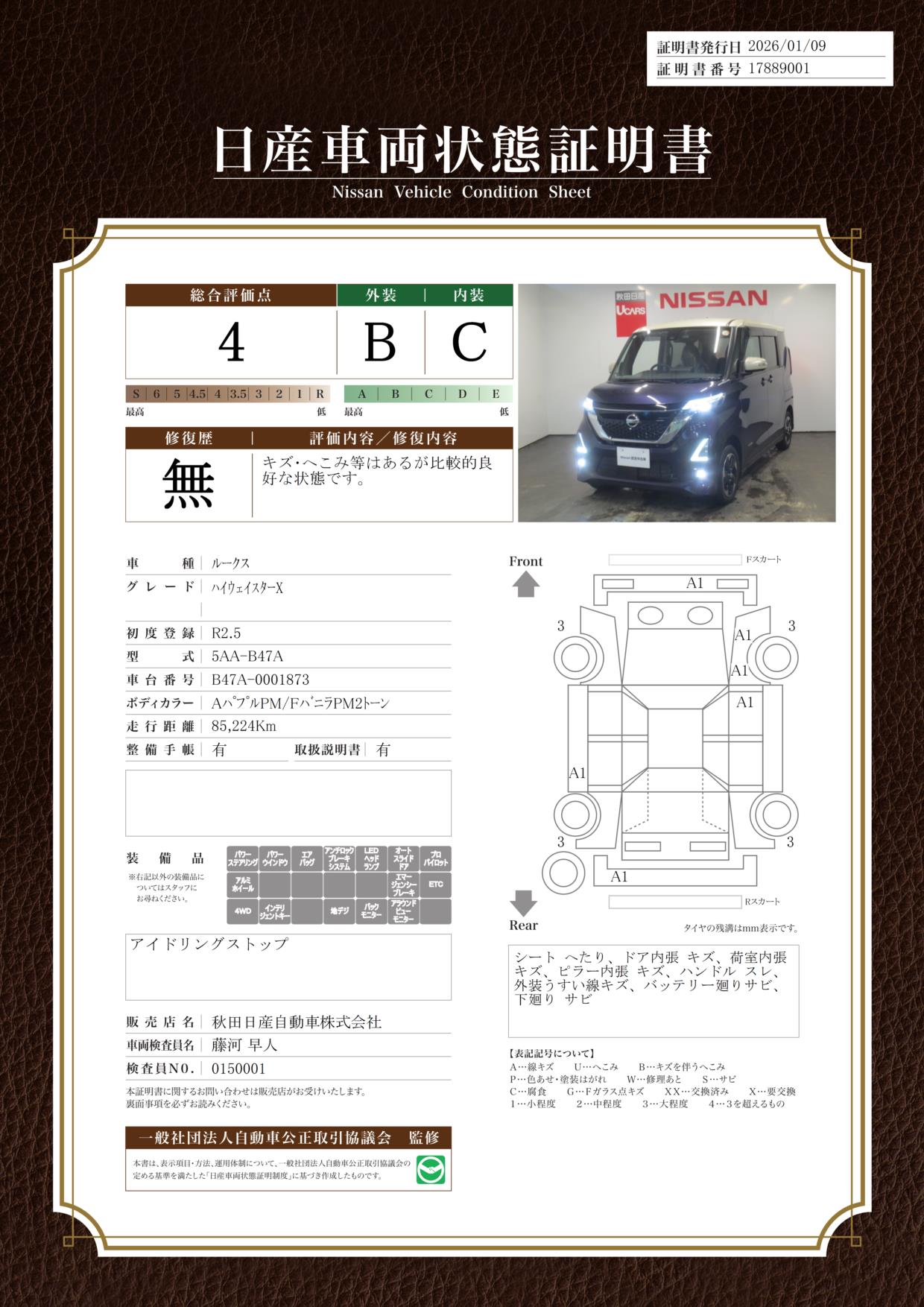 現状括弧書き内の年月まで車検有効期限が残っていますが、ご成約時に新しく車検を取り直します。なお取り直しの費用は車両価格に含まれています。