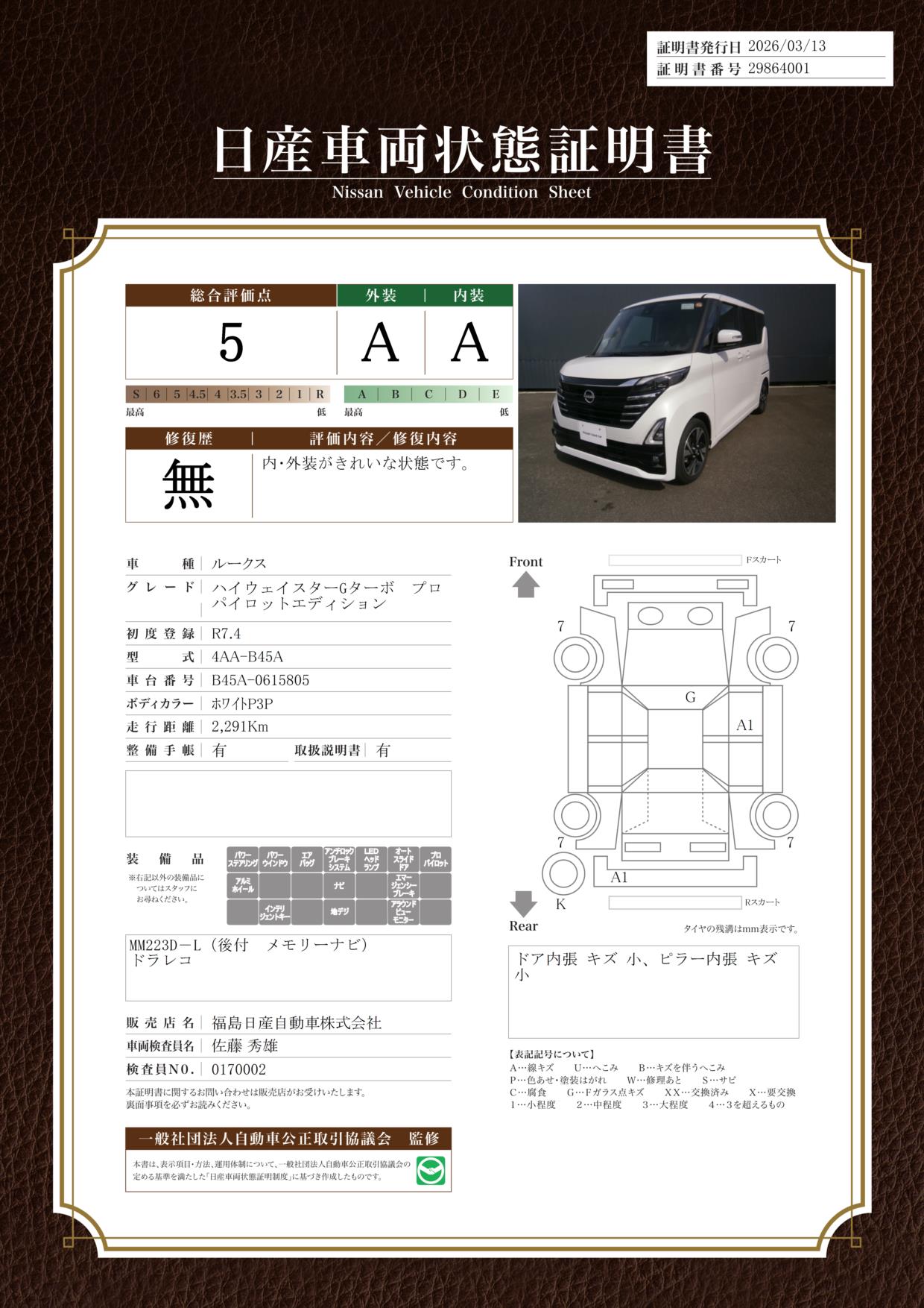 「車両状態証明書」は、査定協会監修のプロの検査員が公正かつ確かな基準で検査した”安心の証”です。