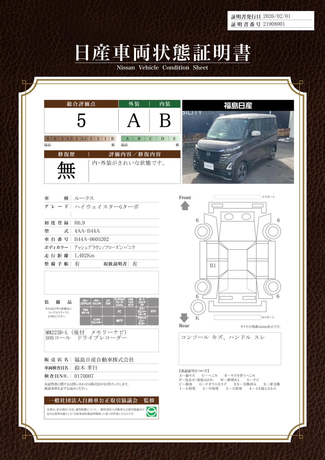 納車時に定期点検整備(費用は車両価格に含まれます。)