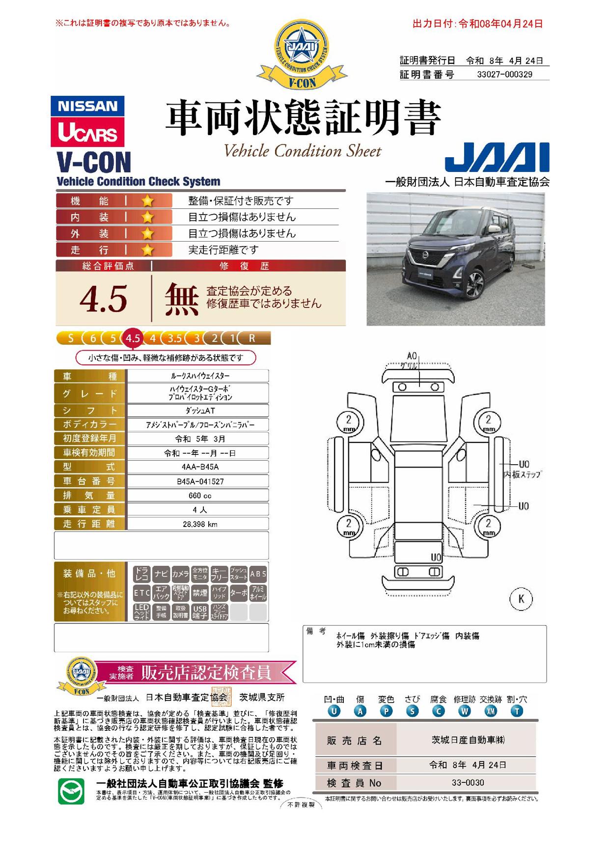 「車両状態証明書」は、査定協会監修のプロの検査員が公正かつ確かな基準で検査した”安心の証”です。