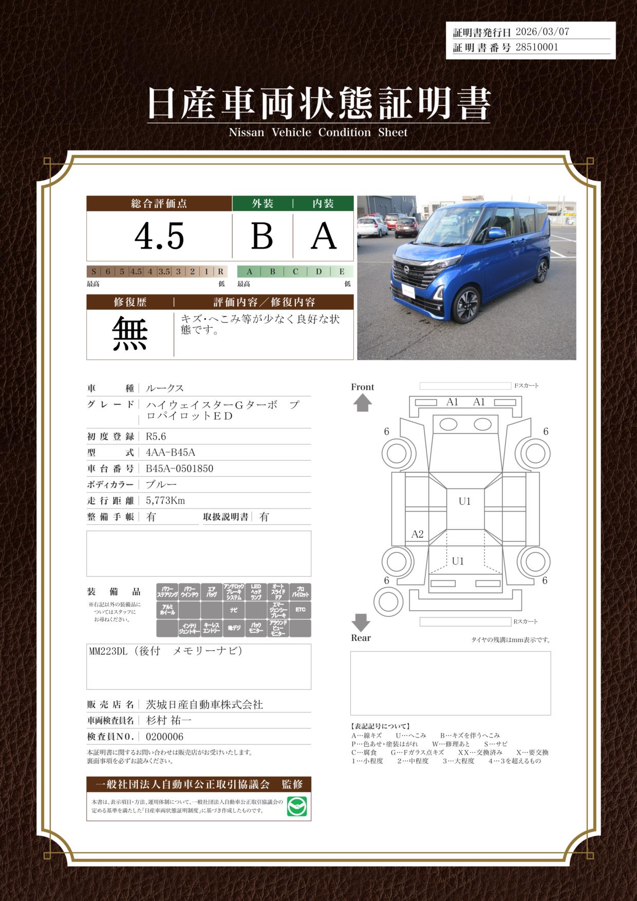 「車両状態証明書」は、査定協会監修のプロの検査員が公正かつ確かな基準で検査した”安心の証”です。