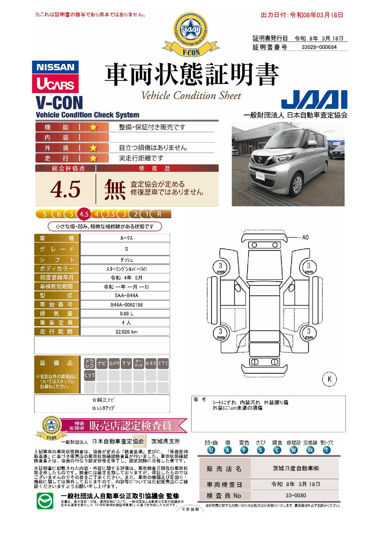 「車両状態証明書」は、査定協会監修のプロの検査員が公正かつ確かな基準で検査した”安心の証”です。