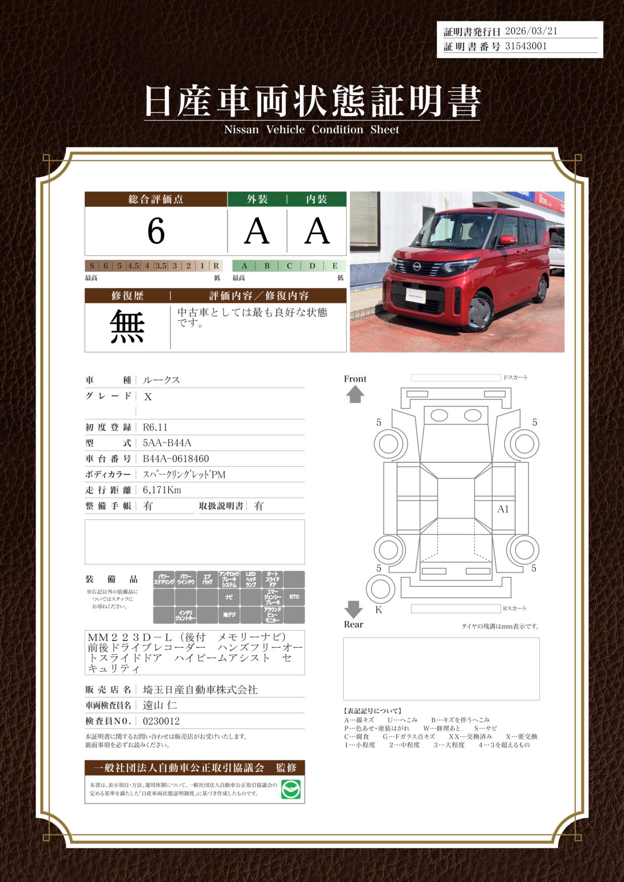 「車両状態証明書」は、査定協会監修のプロの検査員が公正かつ確かな基準で検査した”安心の証”です。