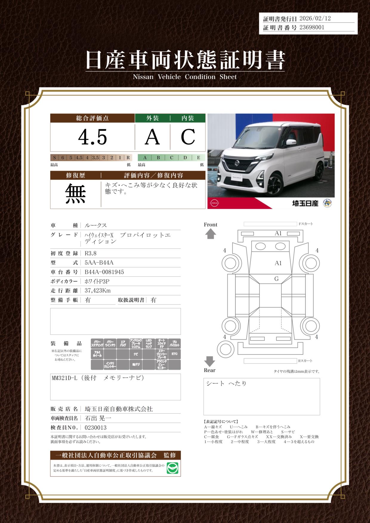 現状括弧書き内の年月まで車検有効期限が残っていますが、ご成約時に新しく車検を取り直します。なお取り直しの費用は車両価格に含まれています。