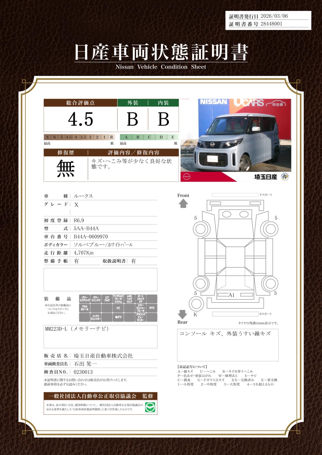 「車両状態証明書」は、査定協会監修のプロの検査員が公正かつ確かな基準で検査した”安心の証”です。