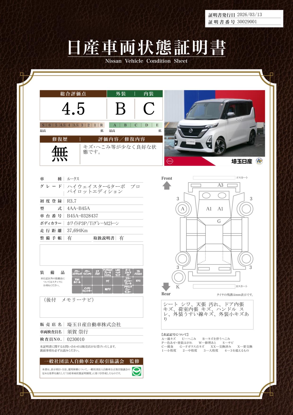 「車両状態証明書」は、査定協会監修のプロの検査員が公正かつ確かな基準で検査した”安心の証”です。