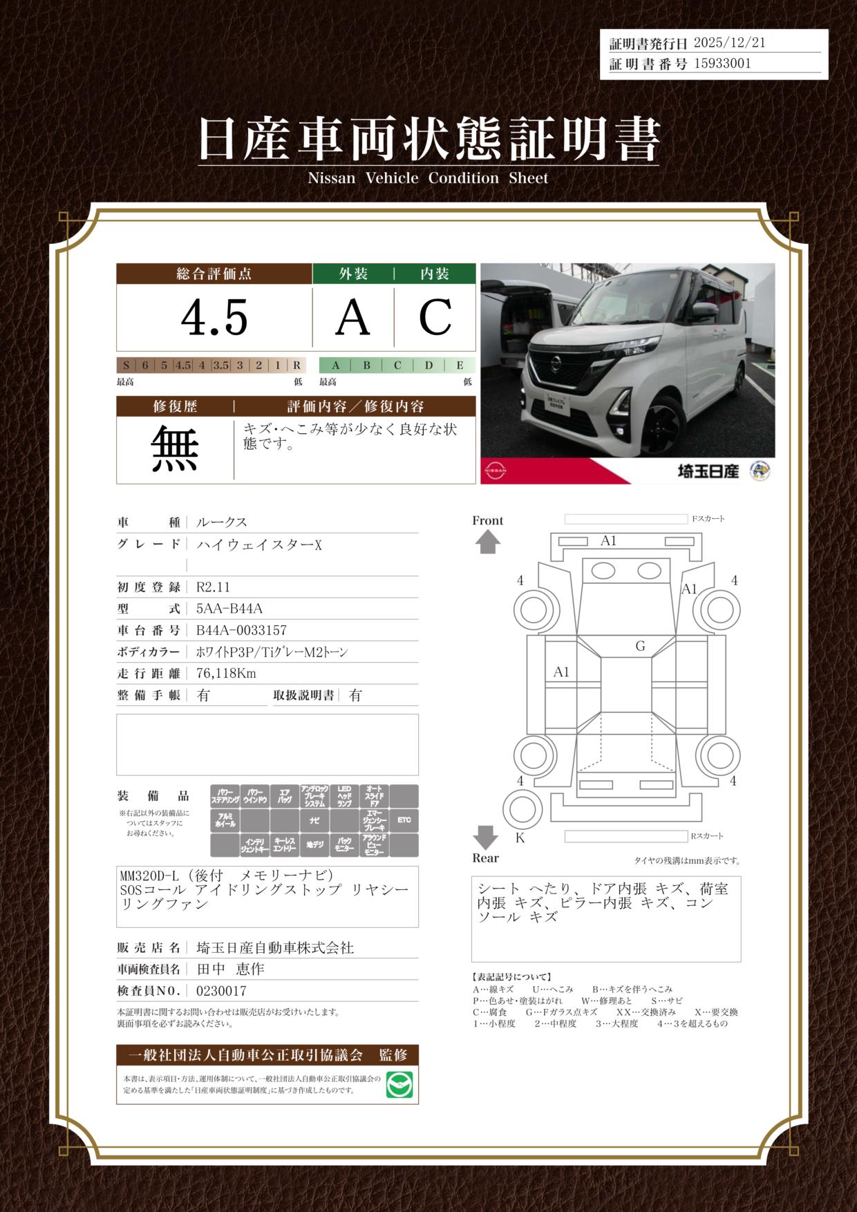 現状車検切れの状態ですが、ご成約時に新しく車検を実施します。車検費用は車両価格に含まれています。
